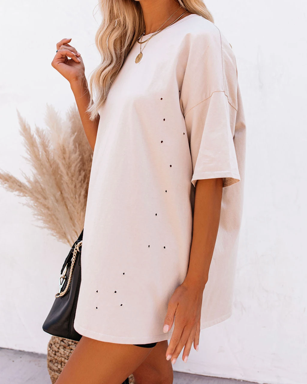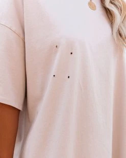 //Best Seller// Comfy and cozy with a little extra room the His Cotton Oversized Tee is just what you need with tiny distressed holes on the front that finish this ultra-casual taupe colored piece.