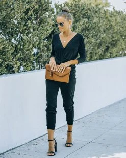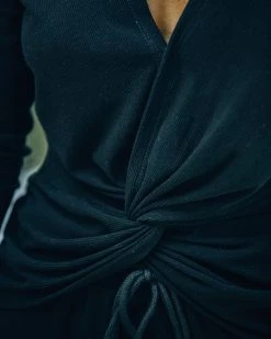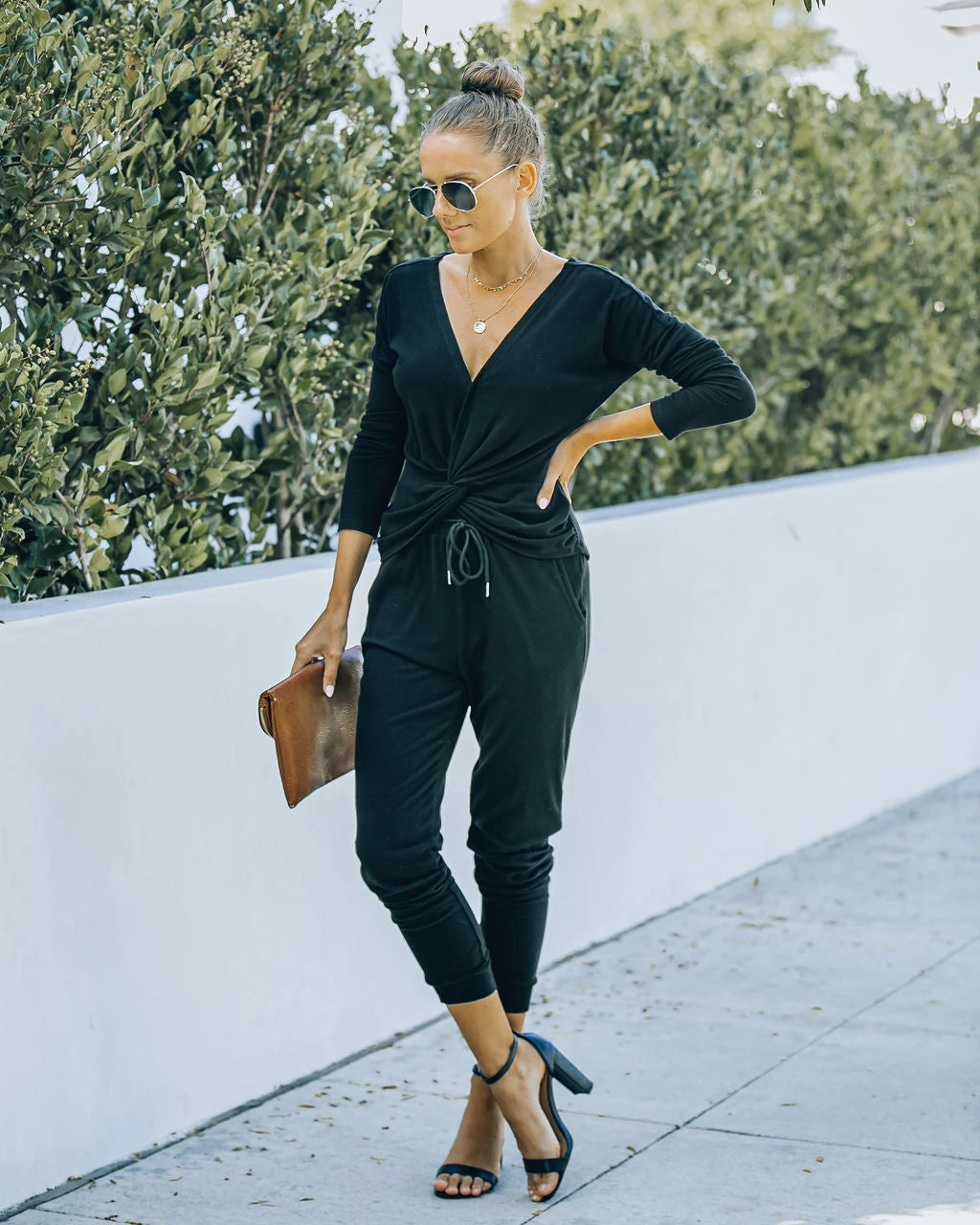 This knit set feels like pajamas but looks so put together! Our Homey Twist Front Knit Top comes in black. Designed with a twist front and a draped neckline. Finished with a snap button closure. Styled with the Chloe Mini Necklace, Compass Coin Necklace, Stella Crossbody Envelope Zip Clutch, Homey Pocketed Knit Joggers, and Whimsy Heel.