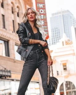 Every city girl needs the Lenny Pocketed Faux Leather Blazer in black that’s detailed with a notched collar and front pockets.