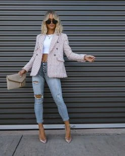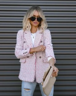 Posh and preppy, the Miranda Tweed Plaid Blazer in cream and red features a notched collar.