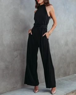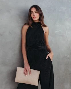 Look elegant for your event in the Naya Pocketed Plisse Jumpsuit in black that features a wide pant leg. Â