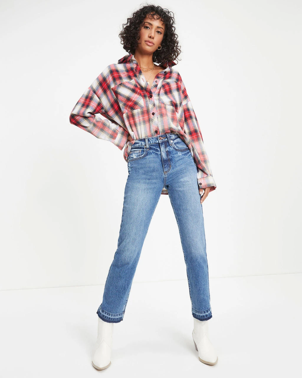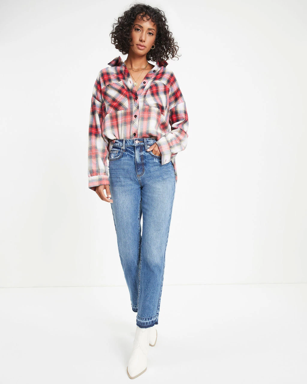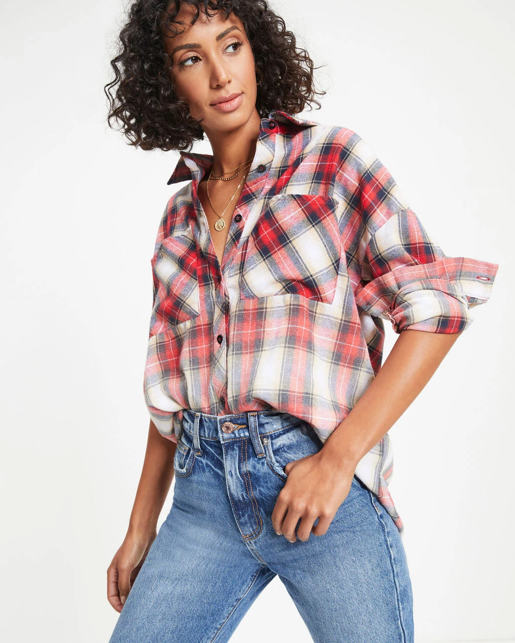 Your Fall wardrobe needs the New Beginnings Plaid Gradient Button Down Top in red multi that features a collar.