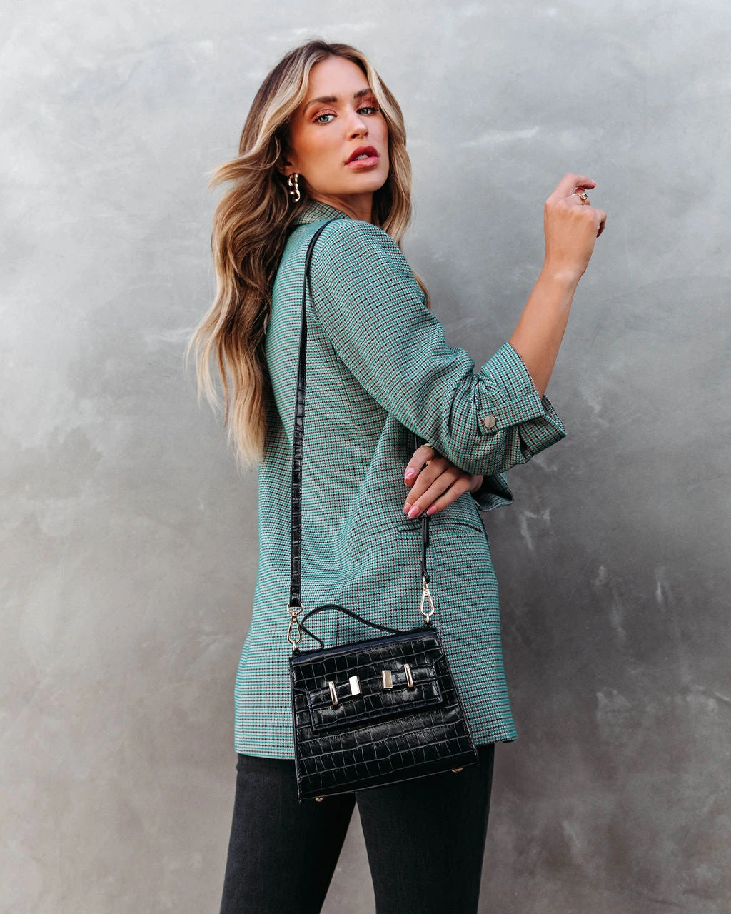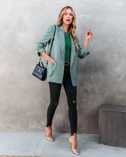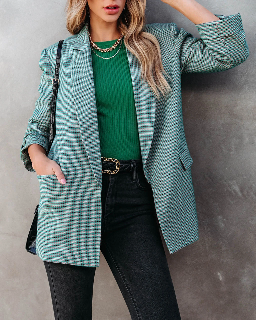 Boss babes will love the No Brainer Pocketed Plaid Blazer in green multi that features padded shoulders.