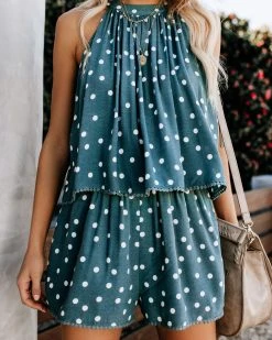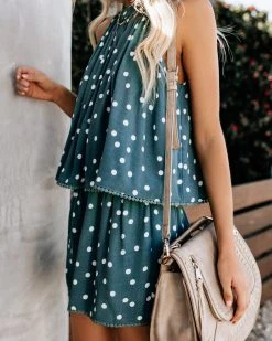 //Best Seller// How could you not love the Paloma Halter Polka Dot Romper that comes in a gorgeous teal hue with white polka dots throughout.