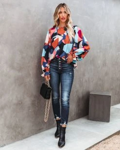 //Best Selling Silhouette// Our Parson Abstract Print Blouse is a true work of art! This wine, blue, navy, rust, black, and mauve printed blouse features a crew neckline. Secured with a back button closure. Styled with the Perfect Hoop Earrings, Chloe Mini Necklace, The Buddha Wheel Necklace, Desire Padded Woven Chain Handbag, Tilley Frayed Ankle High Waisted Skinny, and Jocelyn Heeled Bootie.