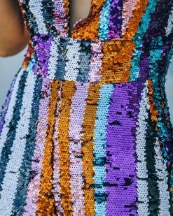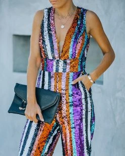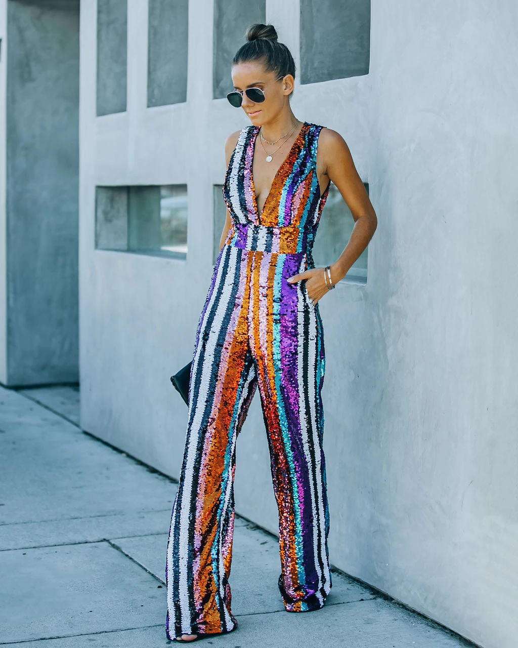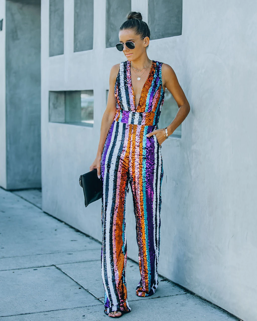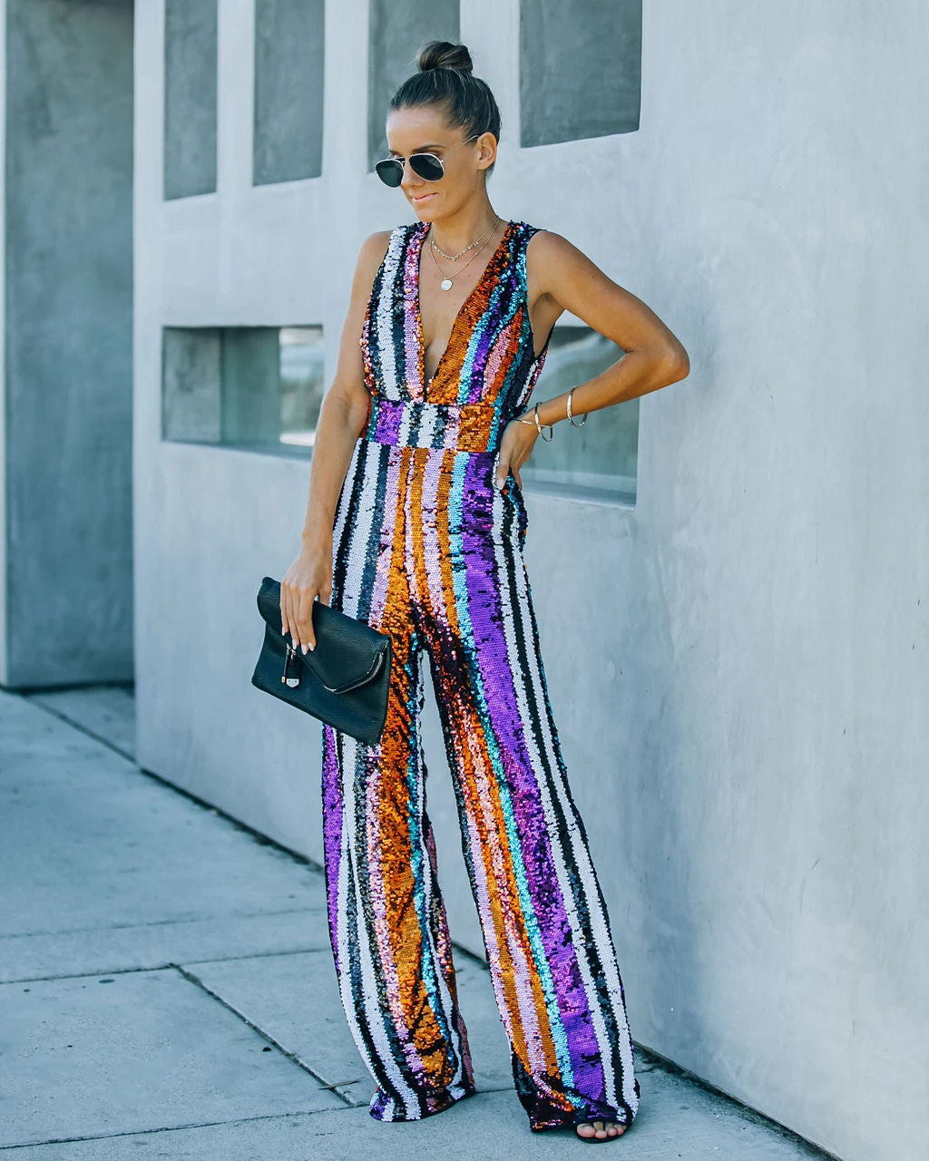 //VICI Exclusive// All eyes will be on you in our Party On The Move Pocketed Sequin Jumpsuit! Black, blue, purple, orange, pink, and white sequins sparkle throughout. Finished with a wide pant leg and a plunging neckline. Styled with the Chloe Mini Necklace, Compass Coin Necklace, Simple Bangle Bracelet, Stella Crossbody Envelope Zip Clutch, and Whimsy Heel.