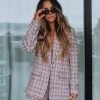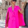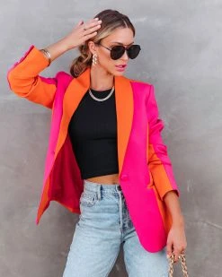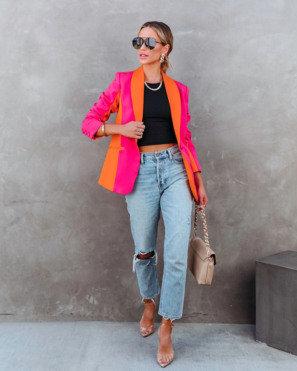 Demand attention in the Show Stopper Babe Pocketed Colorblock Blazer in orange and pink that features padded shoulders.