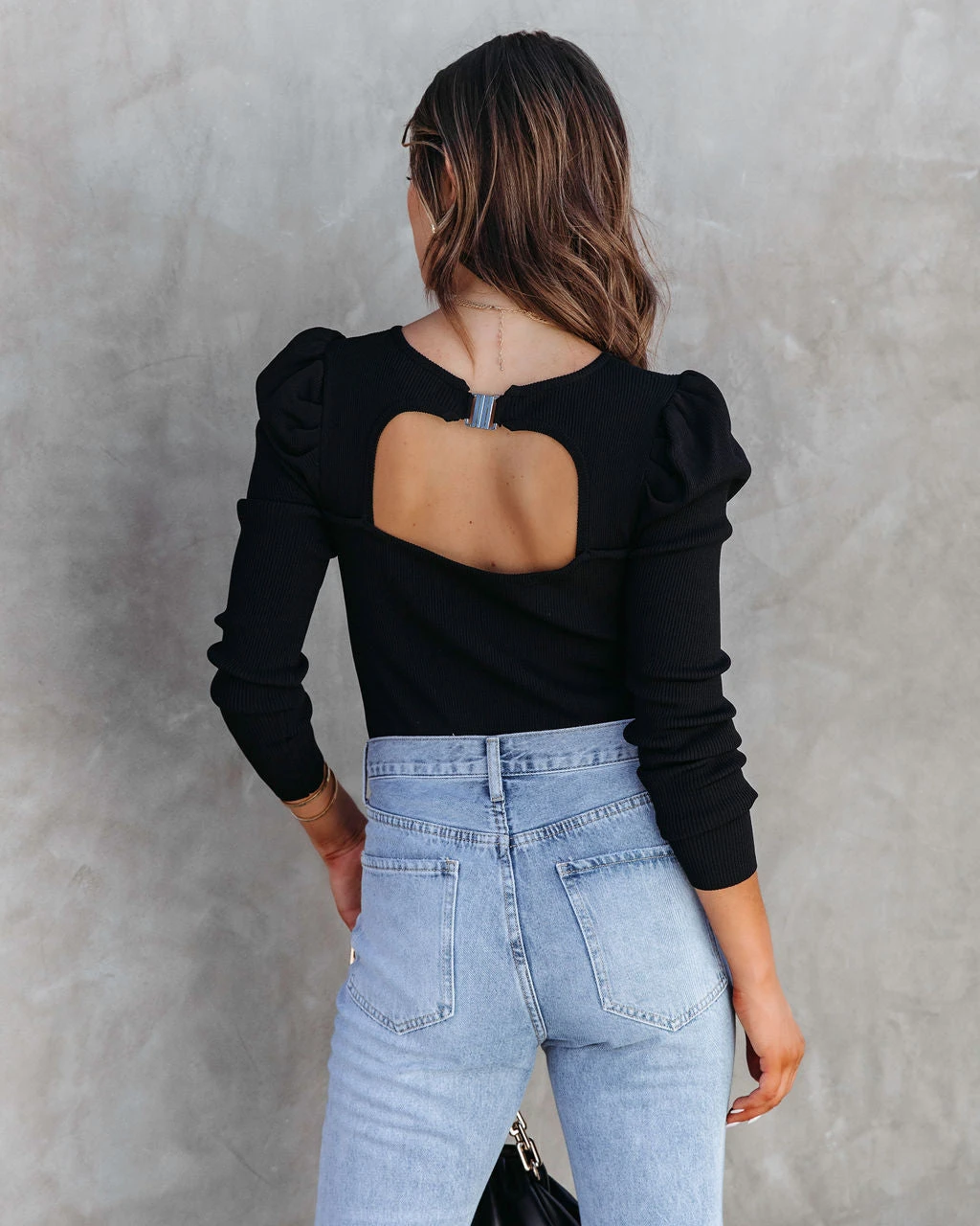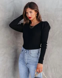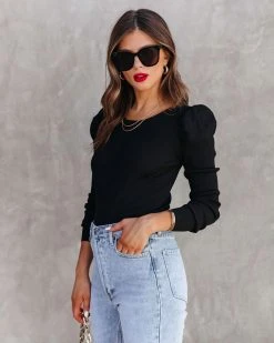 Elevate your office attire in the Sweet + Chic Ribbed Puff Sleeve Top in black that features a stretchy fabrication.