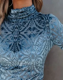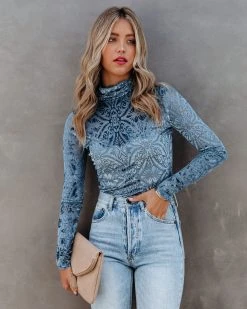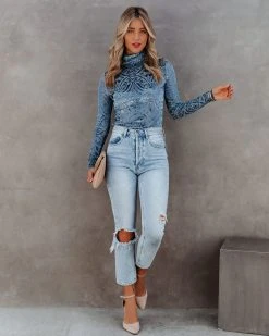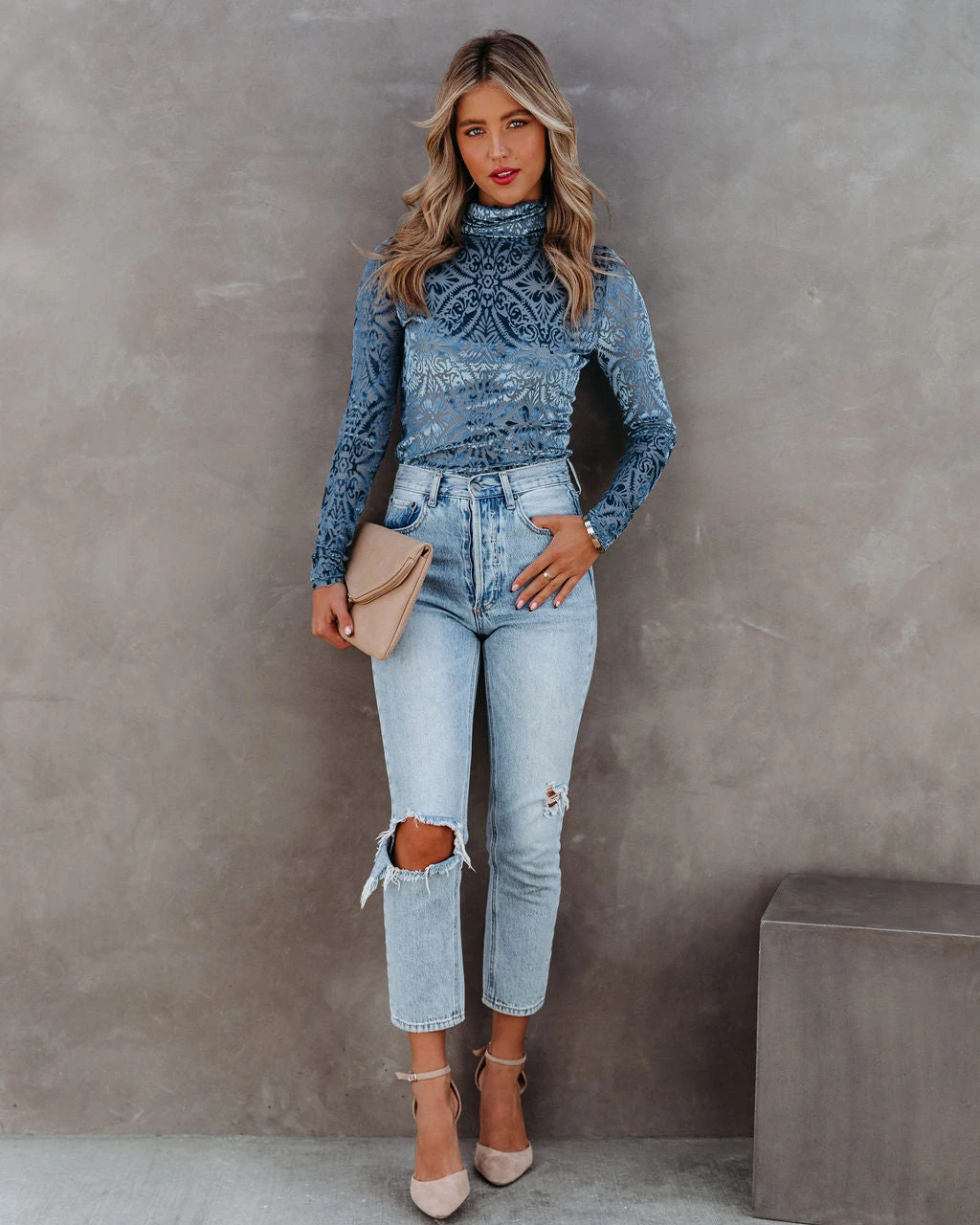 //VICI Exclusive// Show up to your holiday party looking fire in our Tessy Velvet Burnout Turtleneck Top! This blue colored top is crafted with a turtleneck and long sleeves. Just add diamond drop earrings! Styled with the Perfect Hoop Earrings, Stella Crossbody Envelope Zip Clutch, Kason Distressed High Rise Denim, and Ritz Faux Suede Pointed Heel.