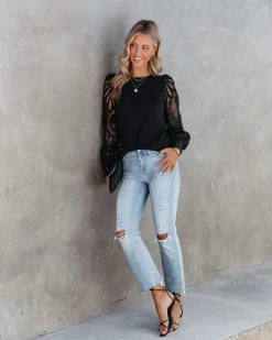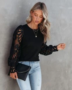 Look cute in the office in the Time For Tea Crochet Lace Top in black that features a crew neckline.