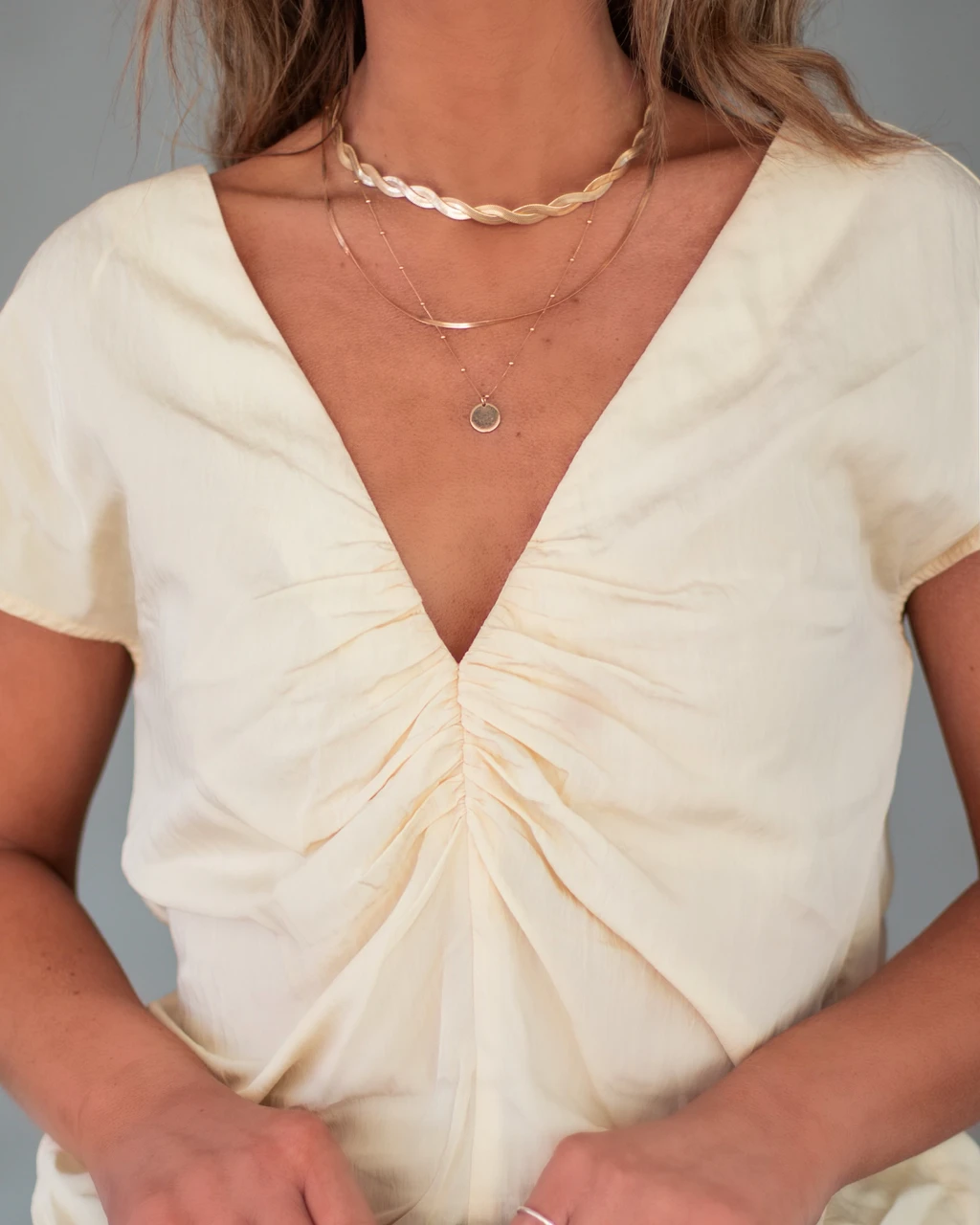 Femme meets classic in the About Jane Ruched V-Neck Top in cream that features a low neckline.