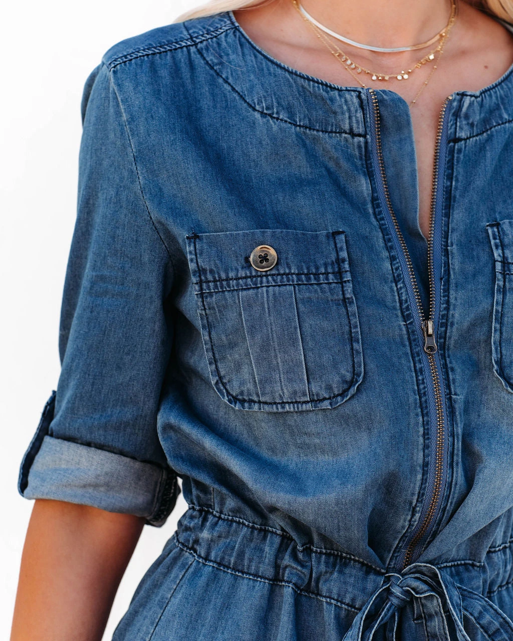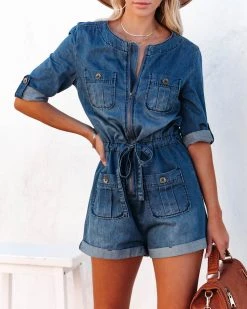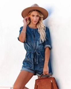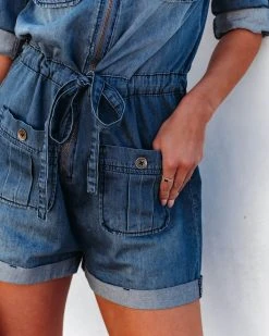 Make getting dressed easy in the Aeron Cotton Pocketed Chambray Romper in dark wash with a drawstring waistband.
