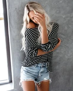 //Best Seller// Be Back Never Striped Relaxed Knit Top is designed with a textured, black and white striped body fitting oversized and relaxed.