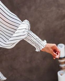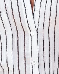 //Best Seller// Timeless and casual, the Coachella Valley Pocketed Striped Button Down Top in white with sienna stripes that’s detailed with a bust pocket and smocked cuffs.