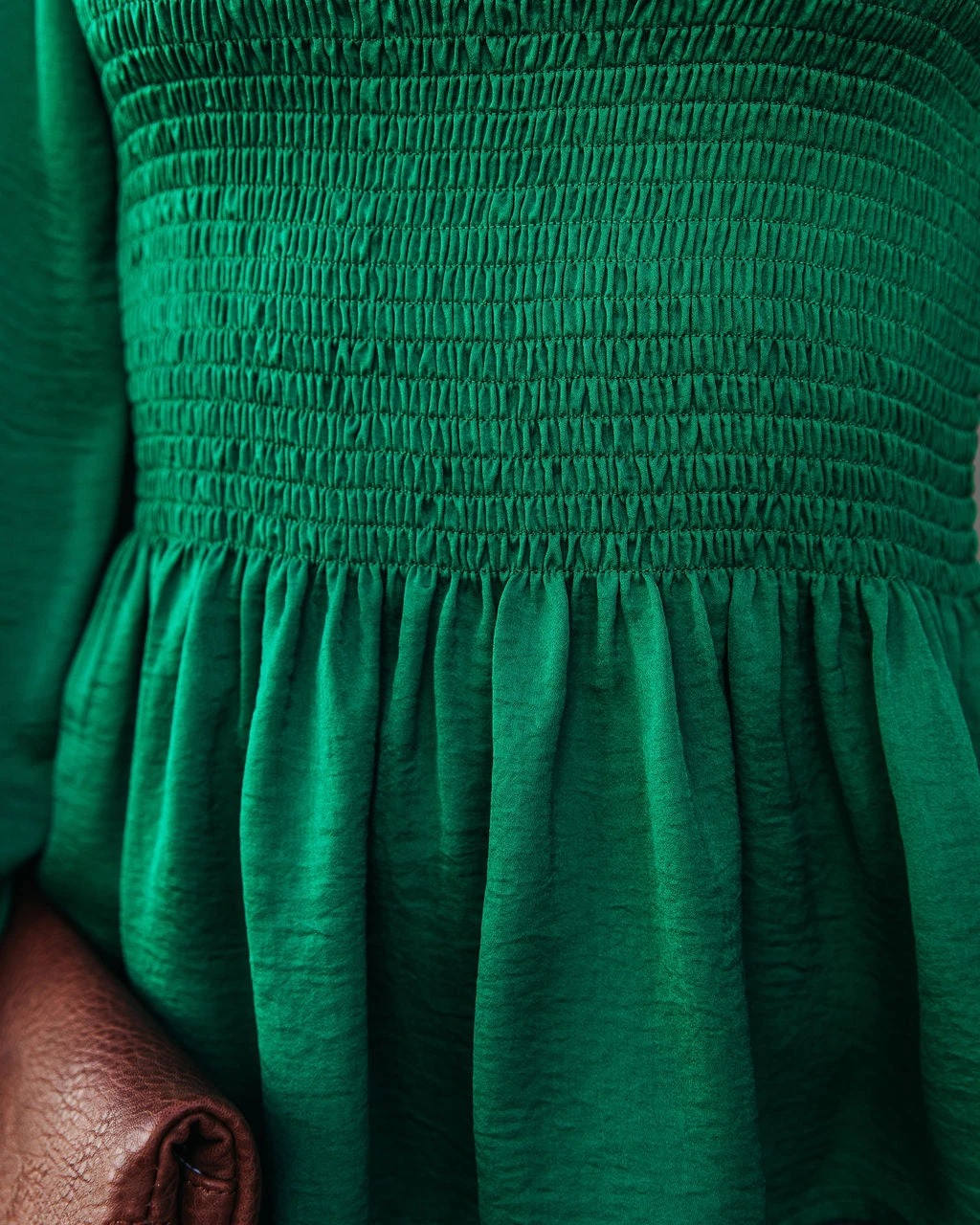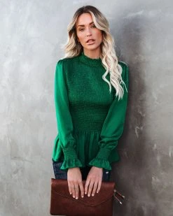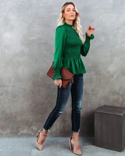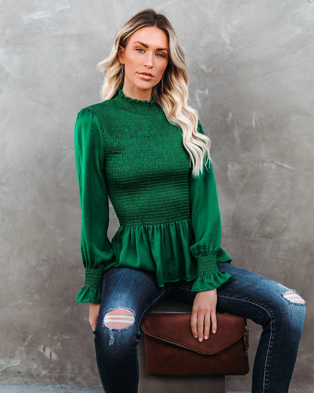 //Best Seller// New Color// Spice things up with the Down To Business Smocked Blouse! The satiny emerald base features a fitted silhouette and a flowy peplum hem. Crafted with a high neckline, cuffed long sleeves and a fully smocked bodice. Chic enough for the office and sultry enough for date night. Styled with the Perfect Hoop Earrings, Stella Crossbody Envelope Zip Clutch, Tilley Frayed Ankle High Waisted Skinny, and Ritz Faux Suede Pointed Heel.