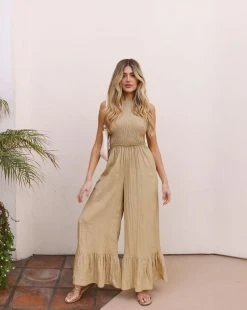 Beach vacay vibes are here! The Golden Coast Dreams Smocked Pocketed Jumpsuit in latte features an open back and flared bottoms. An elastic drawstring waist cinches this number perfectly.