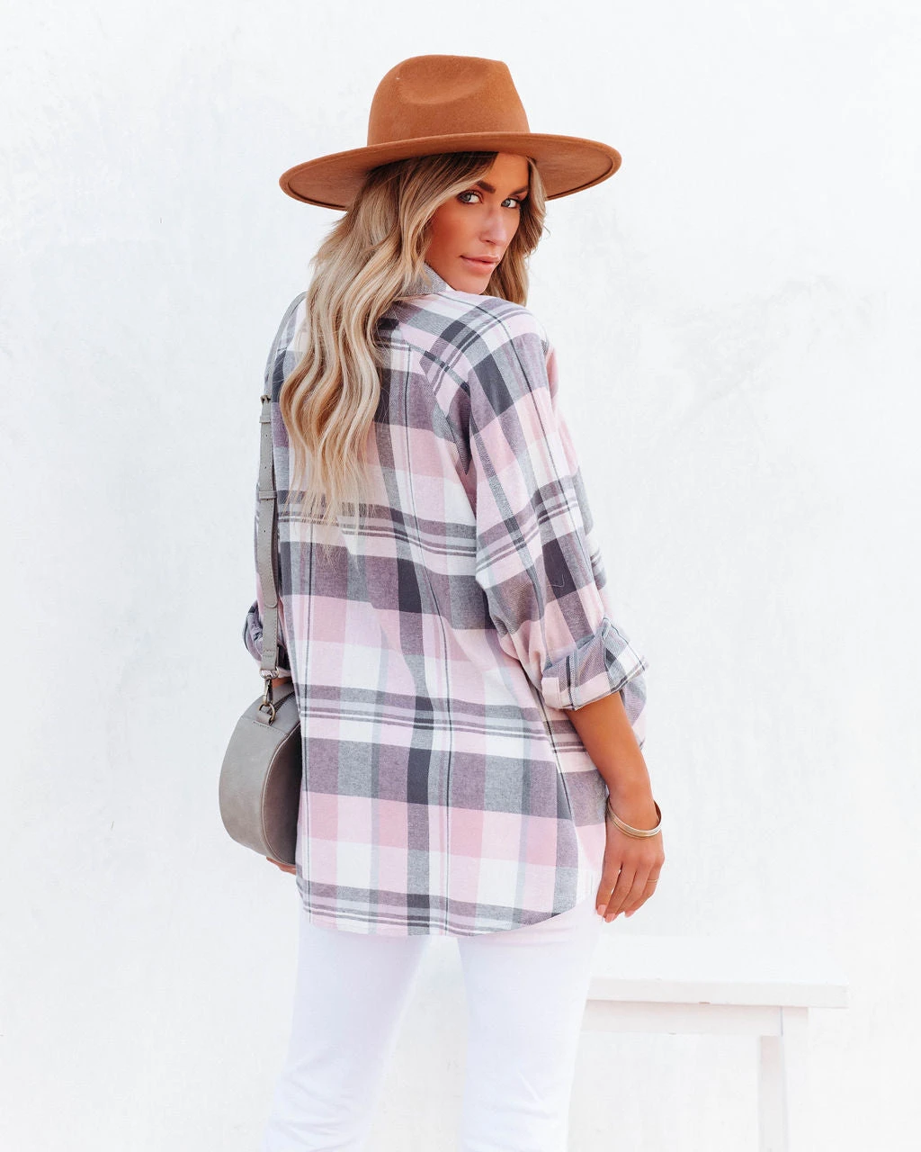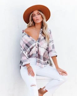 Our Huckson Cotton Plaid Button Down Top is a cool girl look! Pink, grey, and off white hues detail this top. Designed with a bust pocket and a high low hemline. Finished with side slits. Styled with the El Dorado Hat, Perfect Hoop Earrings, Chloe Mini Necklace, Mosaic Coin Necklace, Simple Bangle Bracelet, Round Town Crossbody Bag, Henderson High Rise Distressed Denim, and Blair Faux Suede Strappy Heeled Sandal.