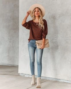 Our Raelle Cotton Blend Striped Top pairs best with boyfriend denim! This brown and navy striped top is detailed with side slits. Designed with a wide neckline and long sleeves. Finished with a relaxed fit. Styled with the Perfect Hoop Earrings, Chloe Mini Necklace, Initial Card Necklace, Stella Crossbody Envelope Zip Clutch, Only The Best High Rise Button Front Denim, and Uptown Faux Suede Heeled Bootie.