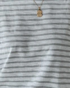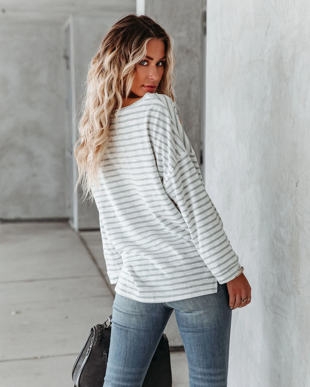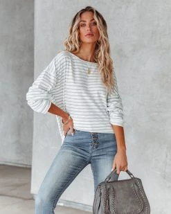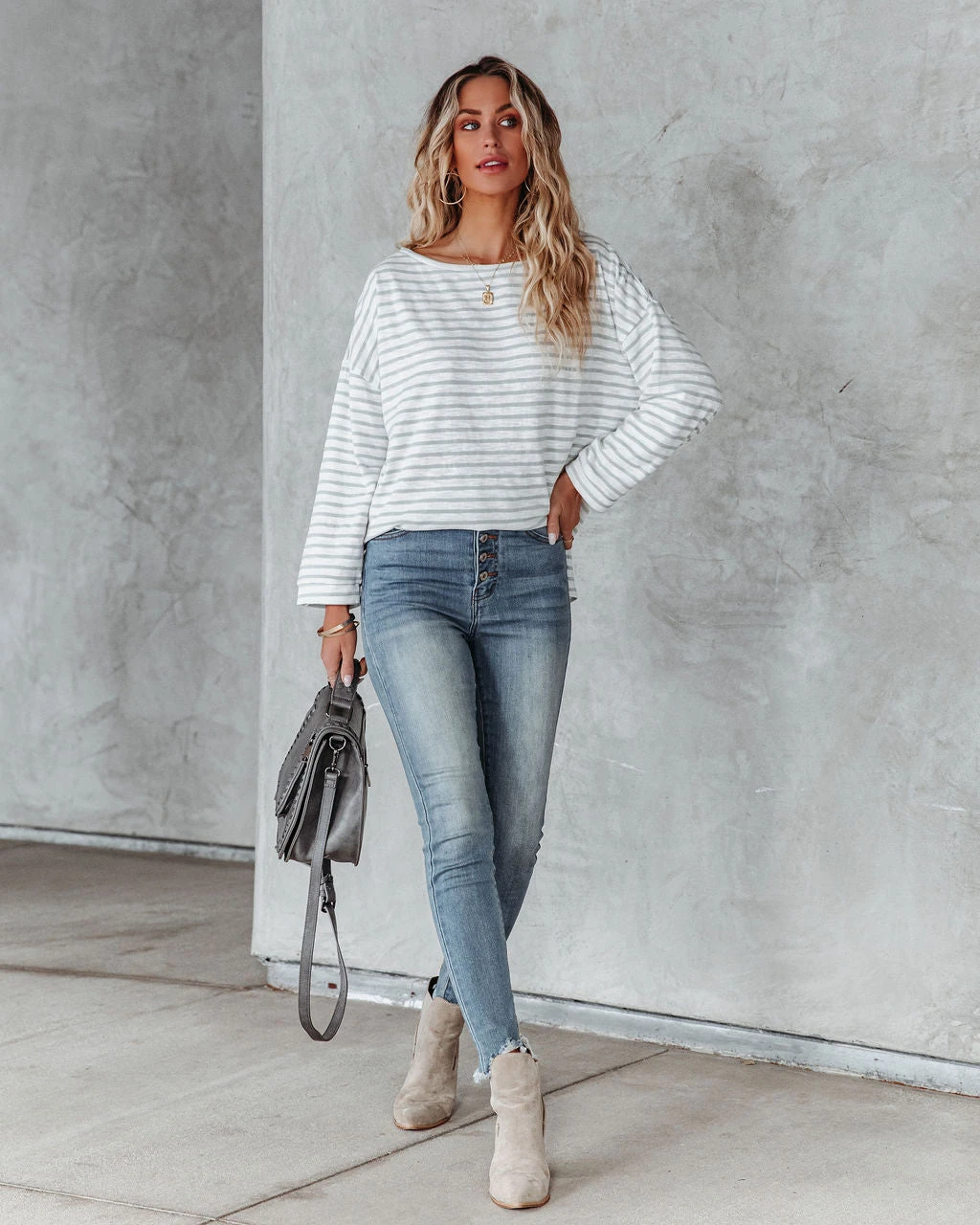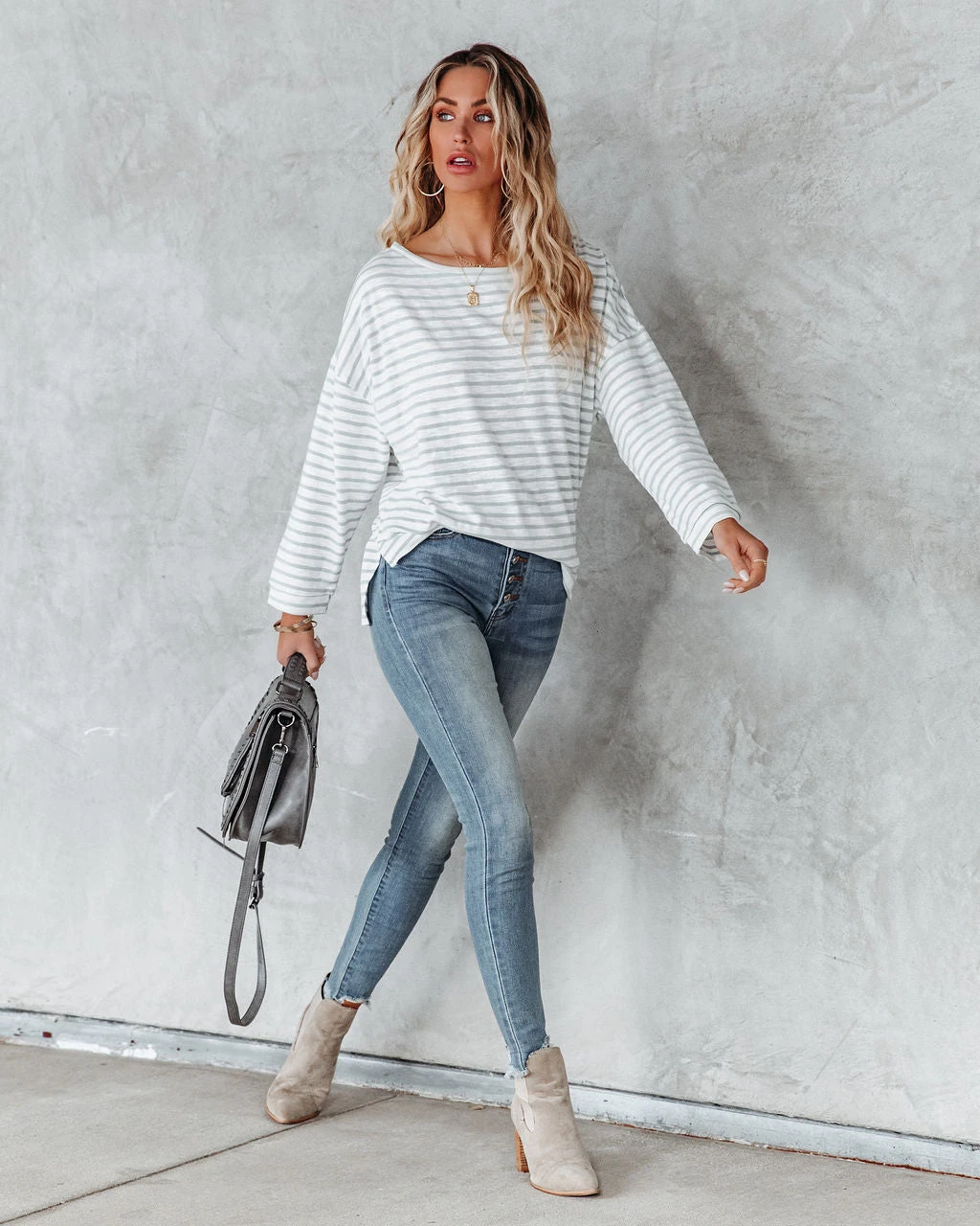 Our Raelle Cotton Blend Striped Top pairs best with boyfriend denim! This white and mint striped top is detailed with side slits. Designed with a wide neckline and long sleeves. Finished with a relaxed fit. Styled with the Perfect Hoop Earrings, Chloe Mini Necklace, Initial Card Necklace, Highland Bag, Only The Best High Rise Button Front Skinny, and Uptown Faux Suede Heeled Bootie.