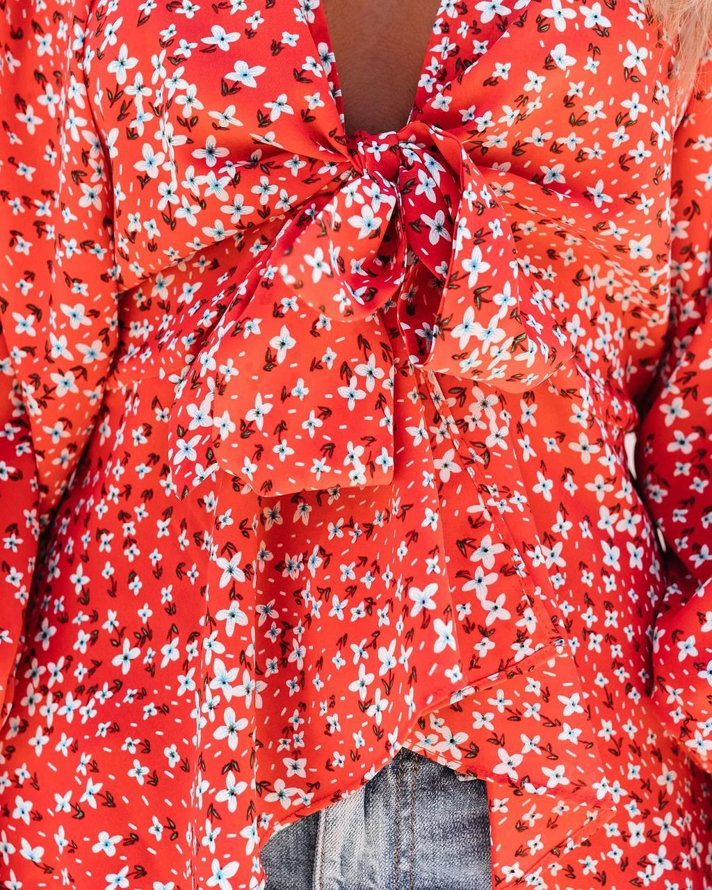 //Best Seller// The Zilla Floral Smocked Tie Blouse features a gorgeous white, sage, olive, and blue floral print in red lightweight base.