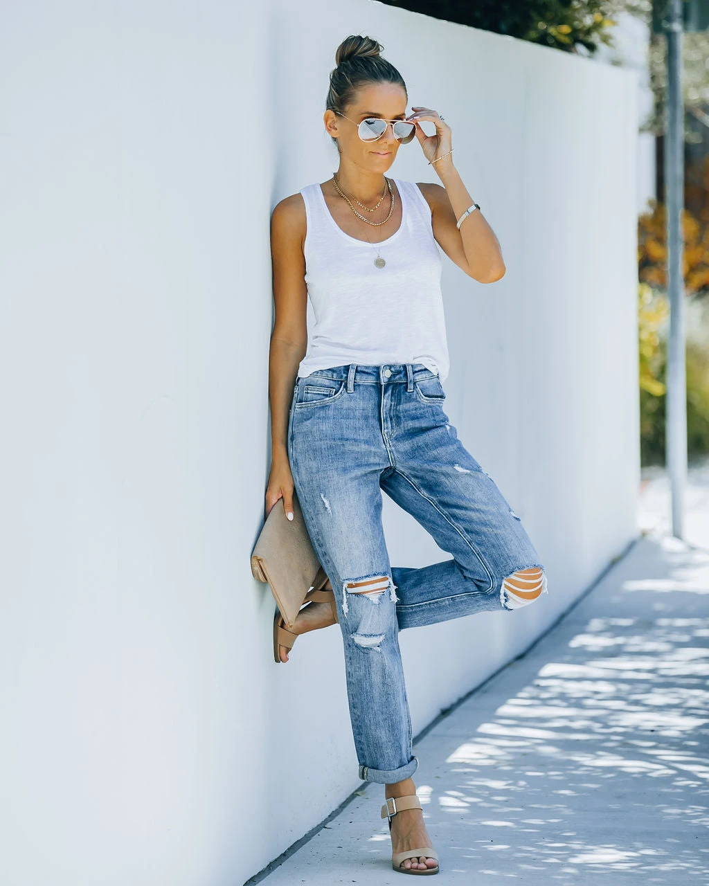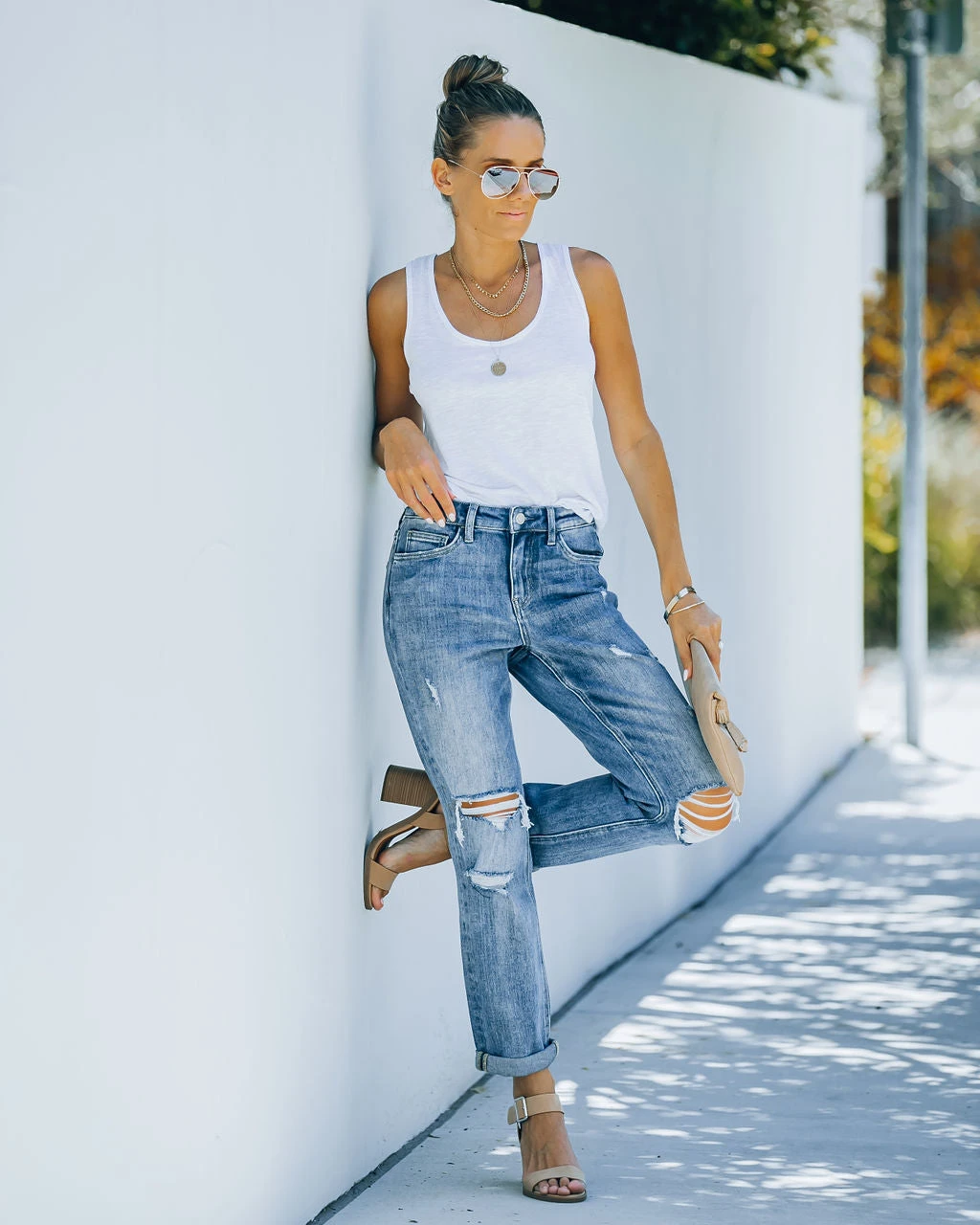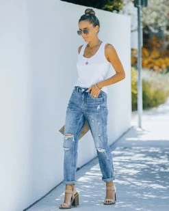//Best Seller// The August High Rise Distressed Girlfriend Denim are such a cool girl look a dark wash with a cuffed hem that can be uncuffed.