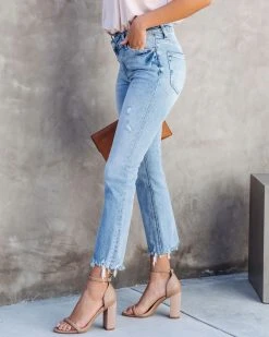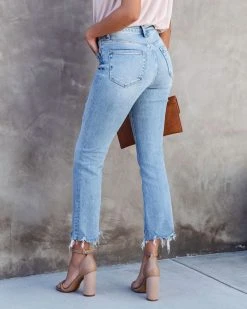 Cute for everyday, the Olivia High Rise Cross Over Crop Flare Jeans in light wash feature a flattering fit.