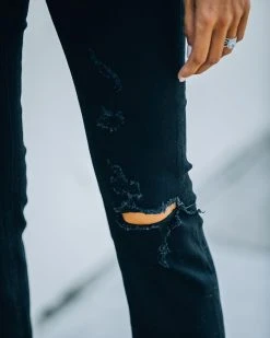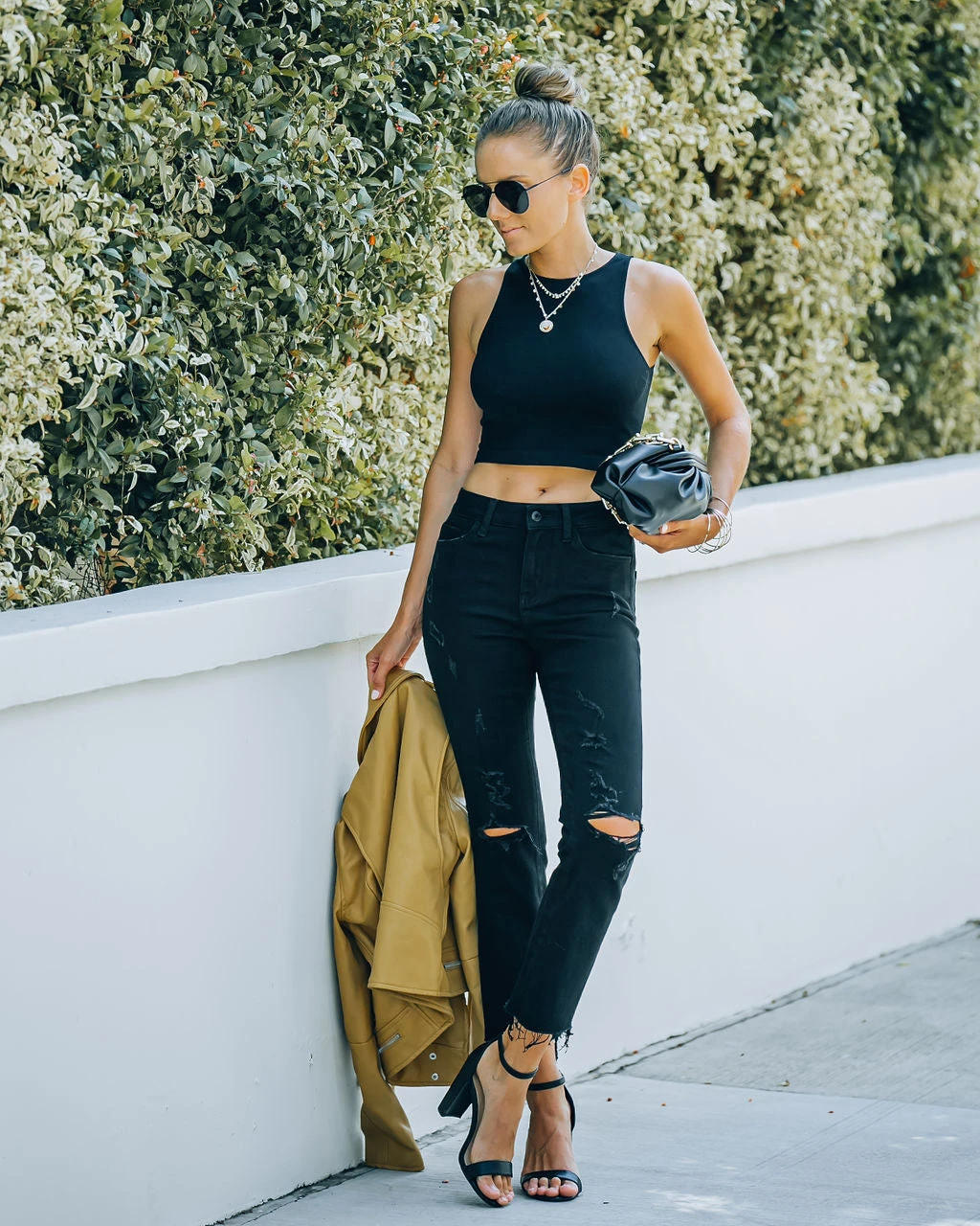 //VICI Exclusive//Best Selling Silhouette//New Wash// Every wardrobe needs classic black denim! Our Sharma High Rise Distressed Denim are designed with a high rise and a light distressing. Secured with a zipper and button closure. Styled with the Chloe Mini Necklace, Judah Pendant Disc Necklace, Simple Bangle Bracelet, Chic Crossbody Chain Pouch Bag, Kiki Knit Crop Top, Gramercy Pocketed Faux Leather Moto Jacket, and Whimsy Heel.