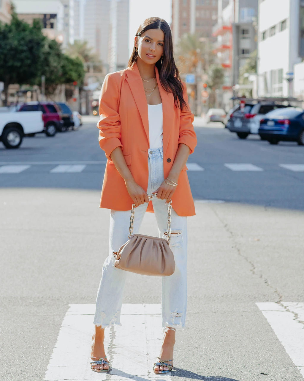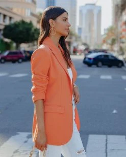 Tailored and trendy, the Joslyn Pocketed Blazer in orange features shoulder pads and front flap pockets.