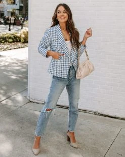 Upgrade your spring work wardrobe in the Lindell Pocketed Tweed Blazer in cobalt, sky blue, off white hues with gold shimmers throughout.