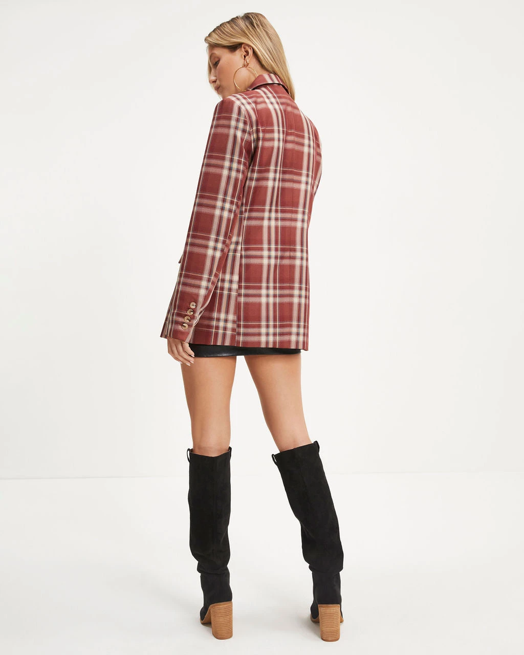 Trendy babes will love the Nadia Pocketed Plaid Blazer in burgundy that features padded shoulders.