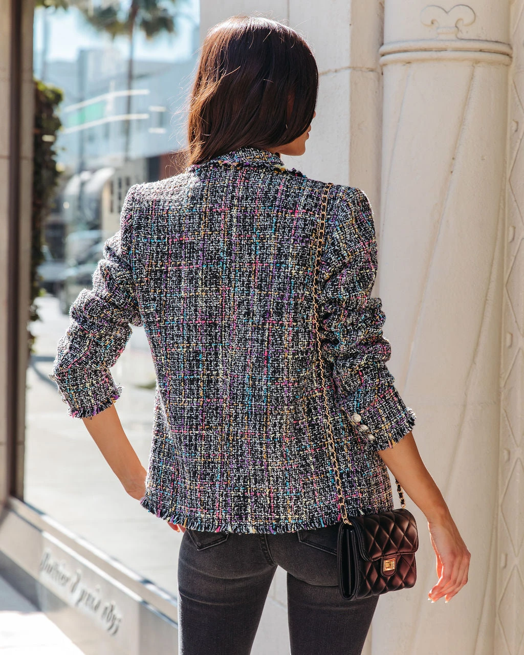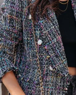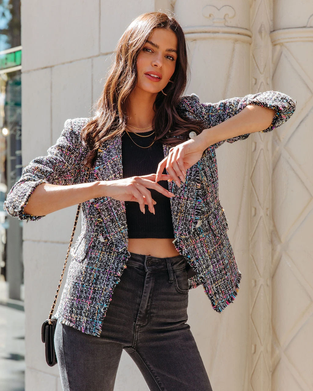 //VICI Exclusive// Look elevated and chic in the Neveah Pocketed Tweed Blazer in black, pink, purple, blue, orange, yellow, and white with a notched collar.