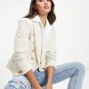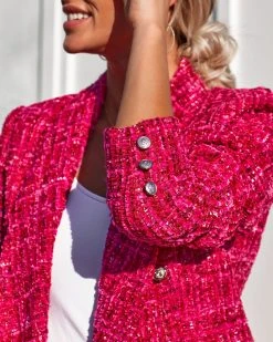 Iconic and chic, the Poised Pocketed Tweed Blazer in fuchsia, red, and pink features front gold buttons.