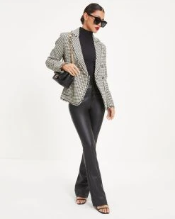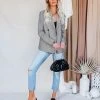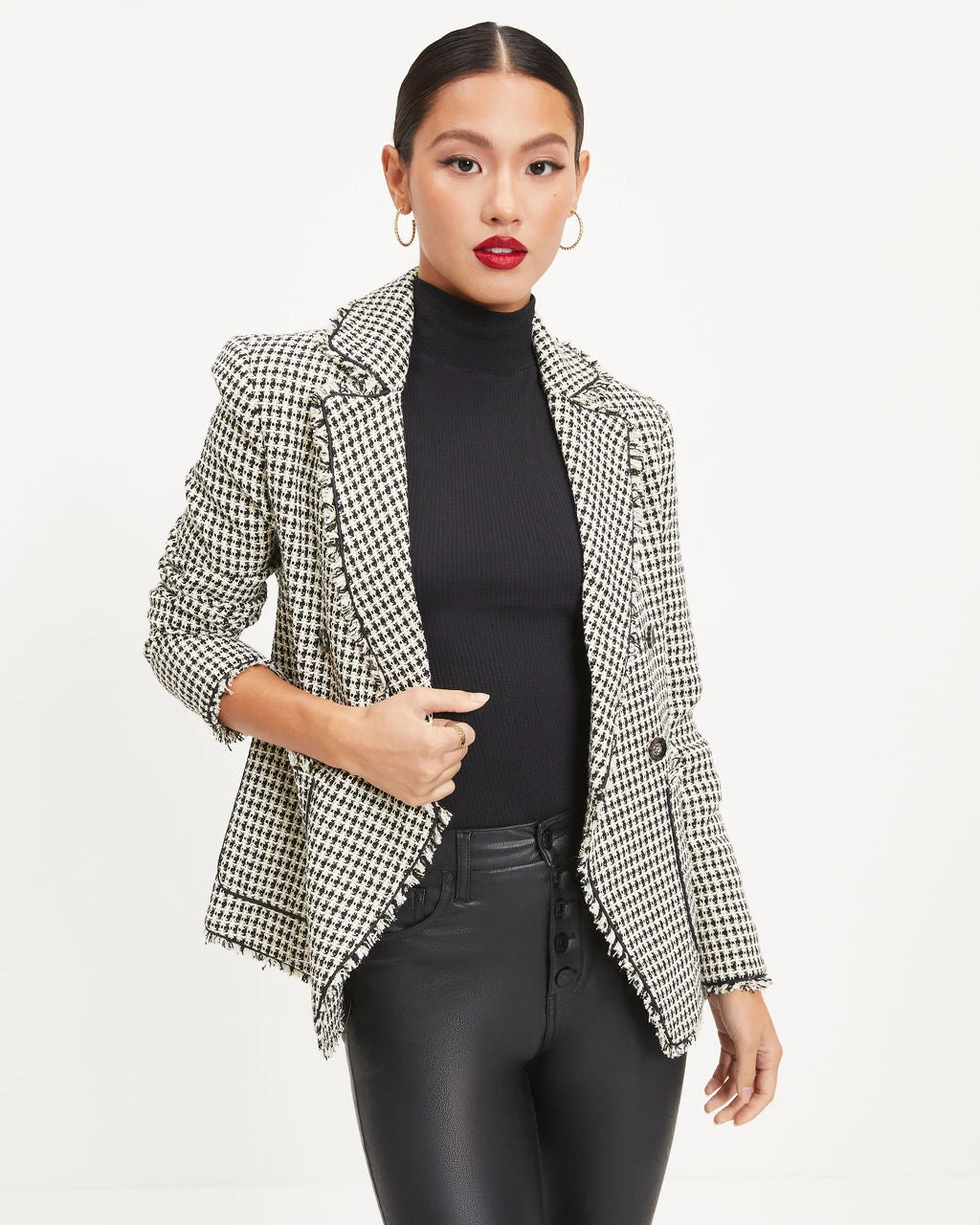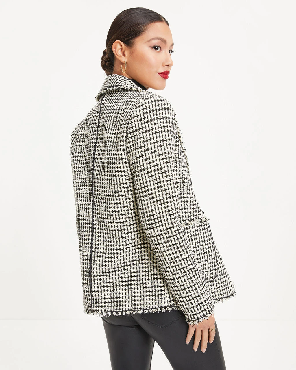 Elevate any look in the Seems About Right Frayed Pocketed Houndstooth Blazer in black and white that features front button closures.