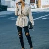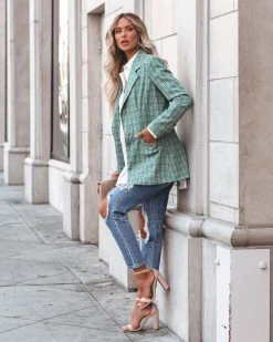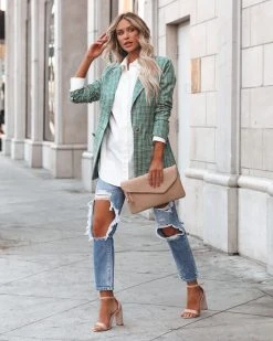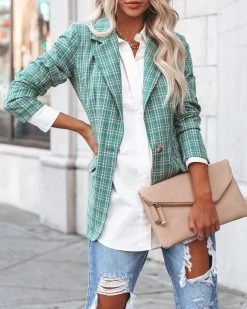 Add a pop of spring style to the Shea Pocketed Plaid Blazer in green and plush plaid hues complete with padded shoulders and a notched collar.Â