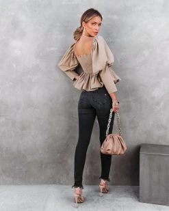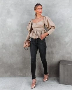 Cute meets femme in the Soph Puff Sleeve Peplum Crop Top in mocha that features an elastic waistband.
