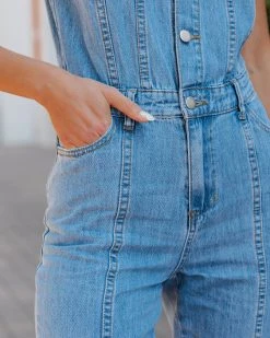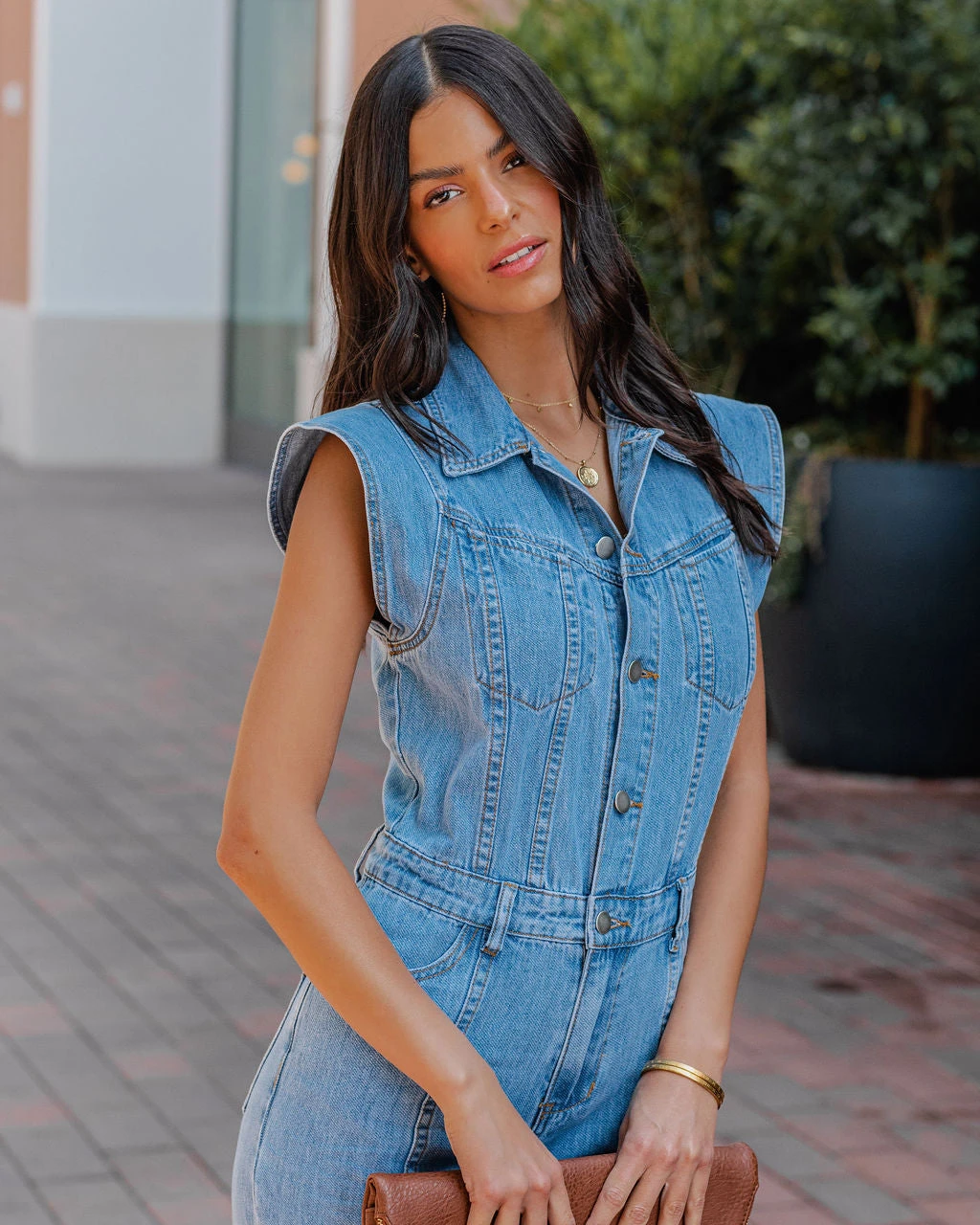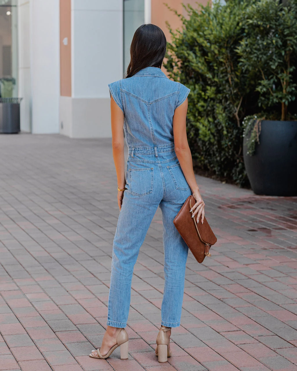 Go for a one and done style in the Alexaly Pocketed Denim Jumpsuit in medium wash that features a straight leg.