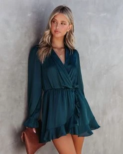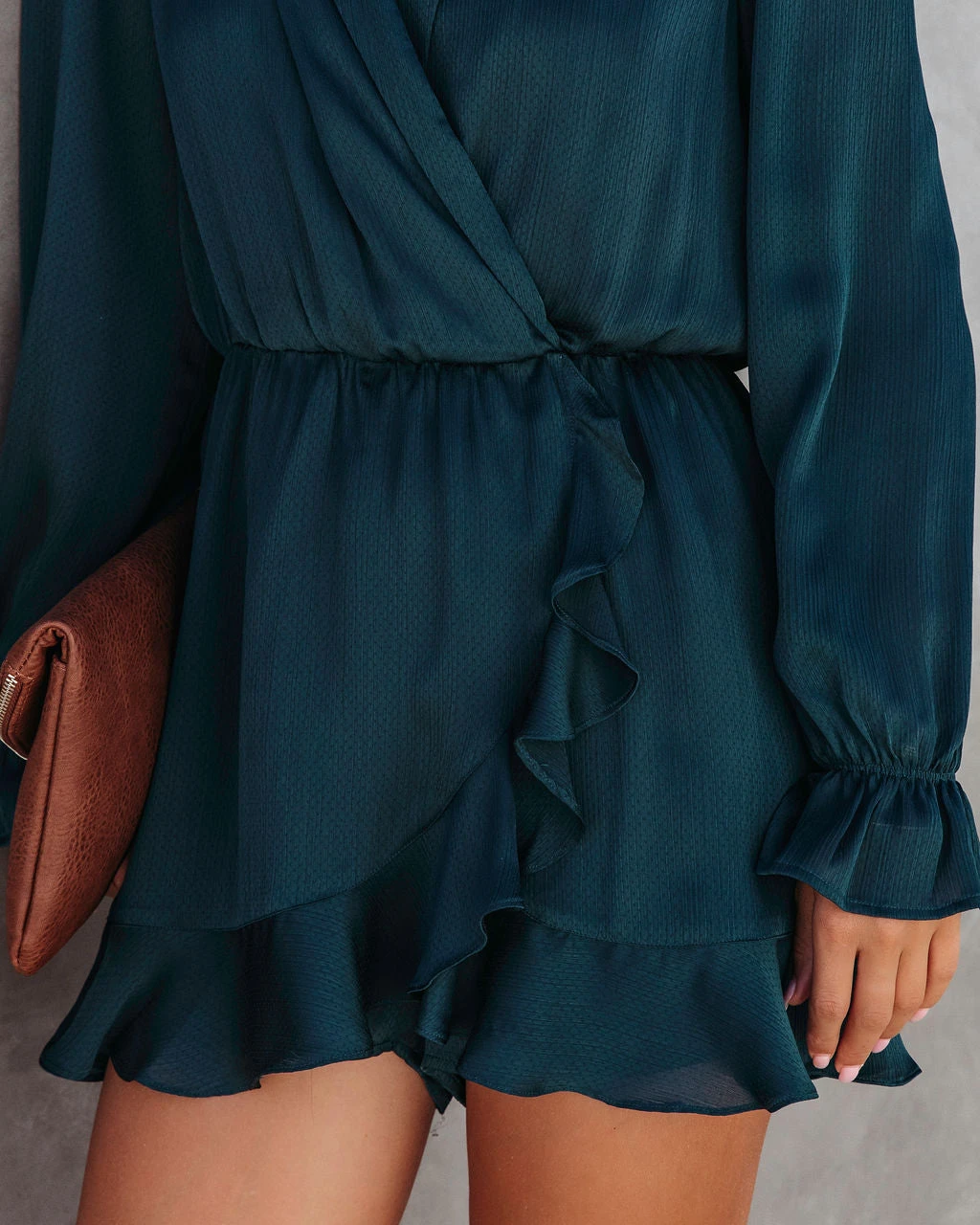 Pretty meets simple in the Audrey Ruffle Romper in teal that features a draped neckline and an elastic waistband.