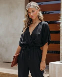 Stroll around town in the Matheo Jumpsuit in black that features side pockets and a draped neckline.