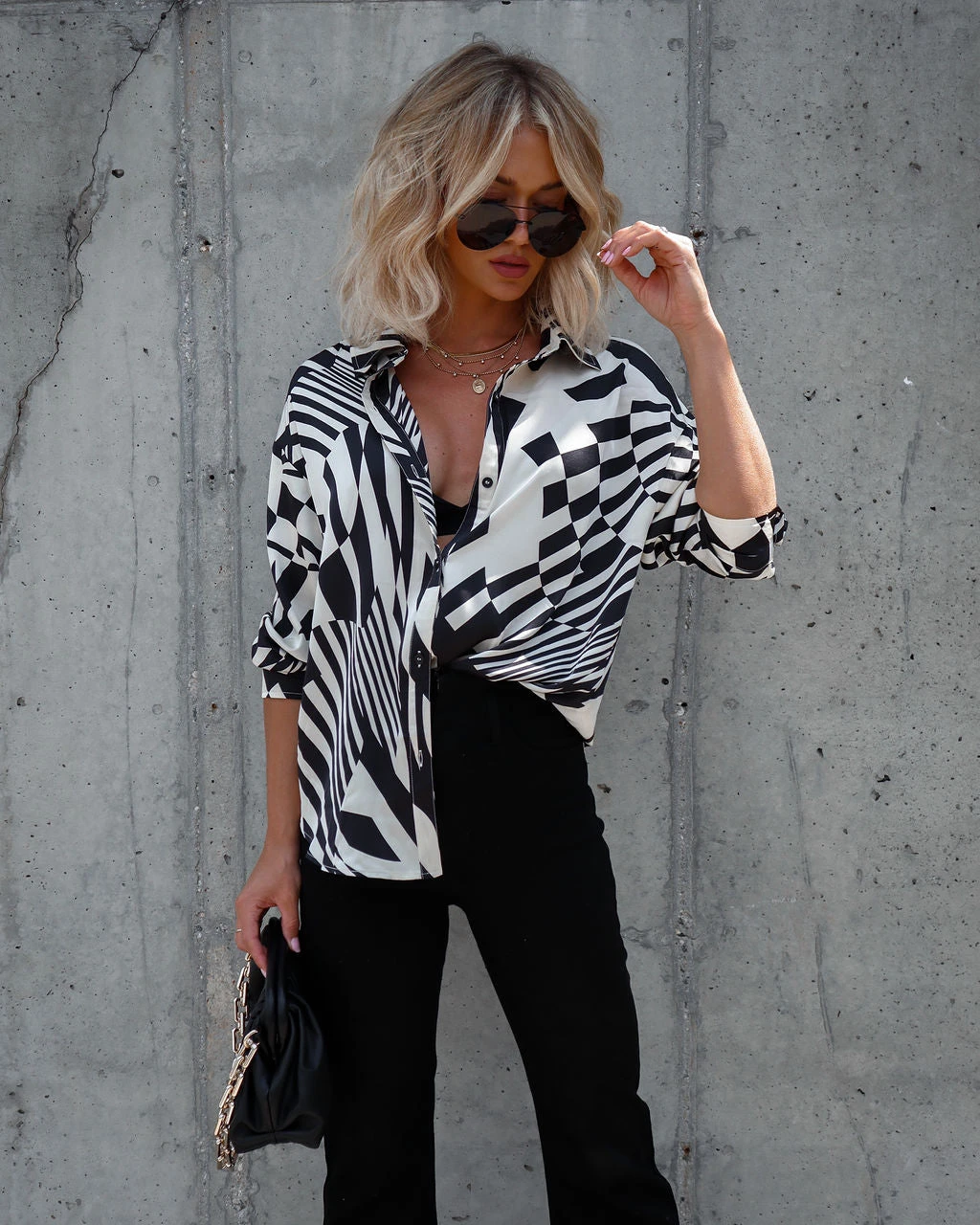 Upgrade your going-out style in the She Was Curious Satin Printed Button Down Top in cream and black that features button cuffs.