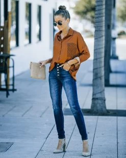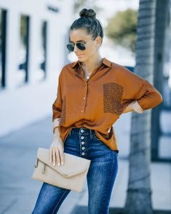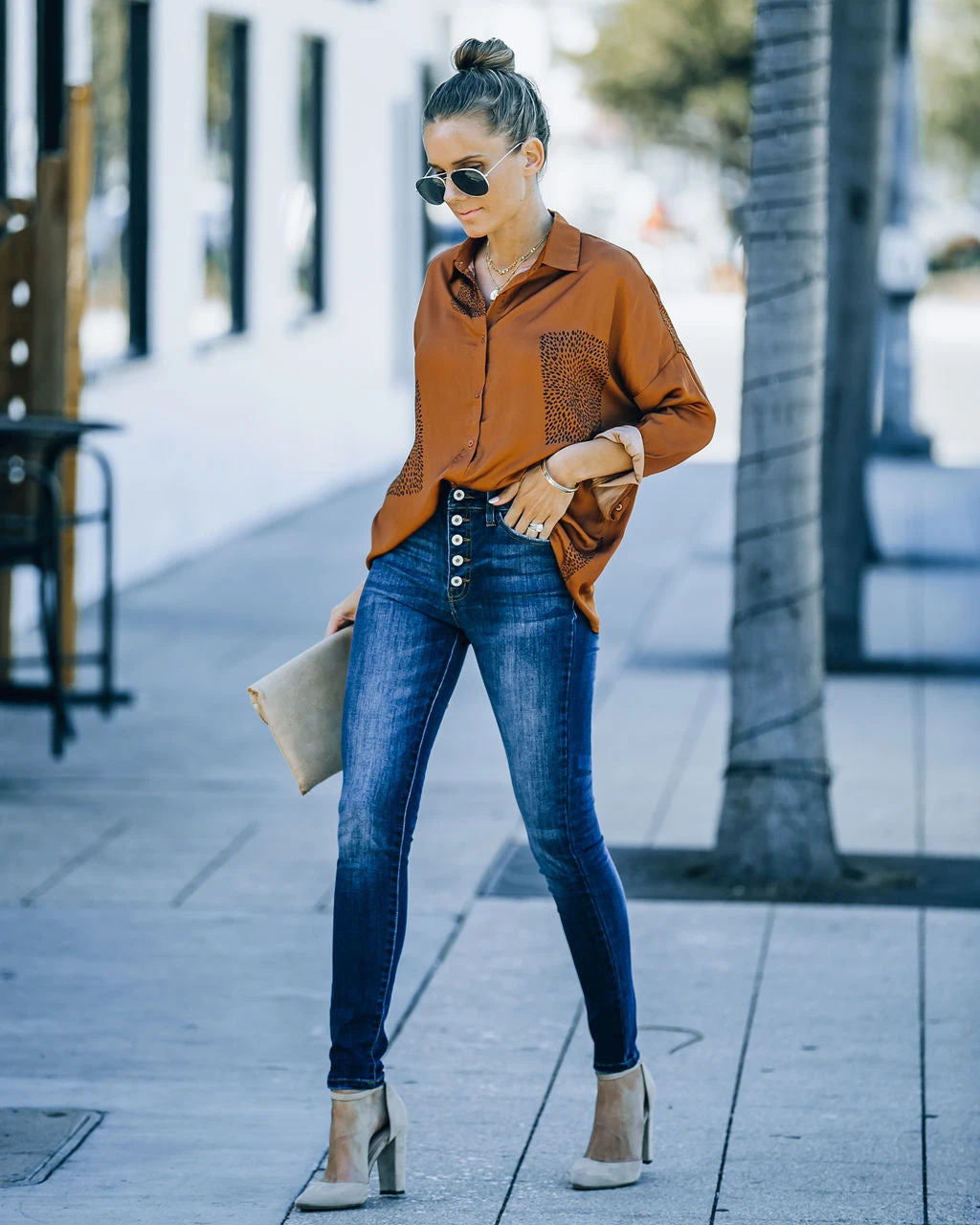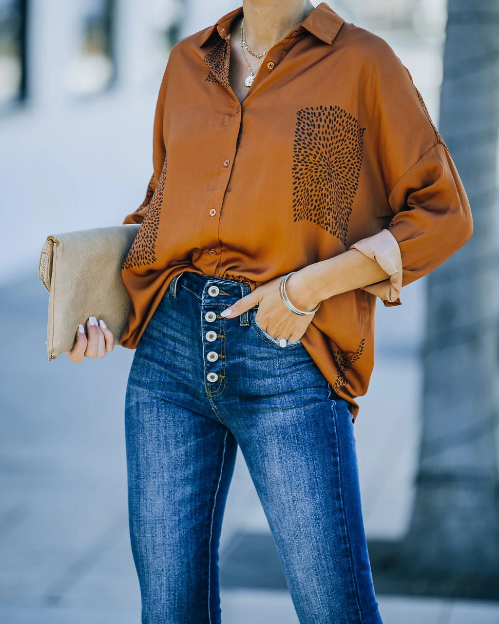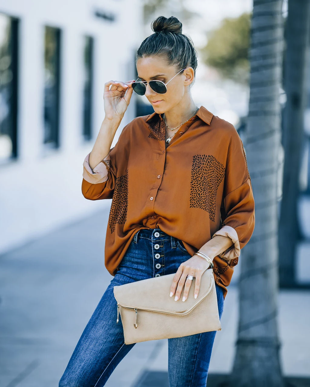 //VICI Exclusive// Our Ellowyn Printed Satin Button Down Blouse is patch perfect! This burnt orange satin shirt features brown printed patches. Designed with a collar and button cuffs. Secured with front button closures. Styled with the Chloe Mini Necklace, Compass Coin Necklace, Simple Bangle Bracelet, Stella Crossbody Envelope Zip Clutch, Nashville High Rise Skinny, and Ritz Faux Suede Pointed Heel.