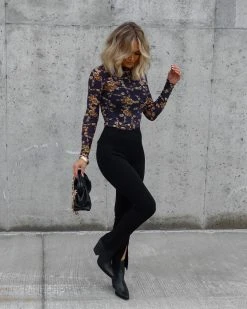 Chic meets trendy in the Honor Floral Sheer Mock Neck Top in navy that features a high neckline.