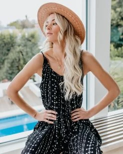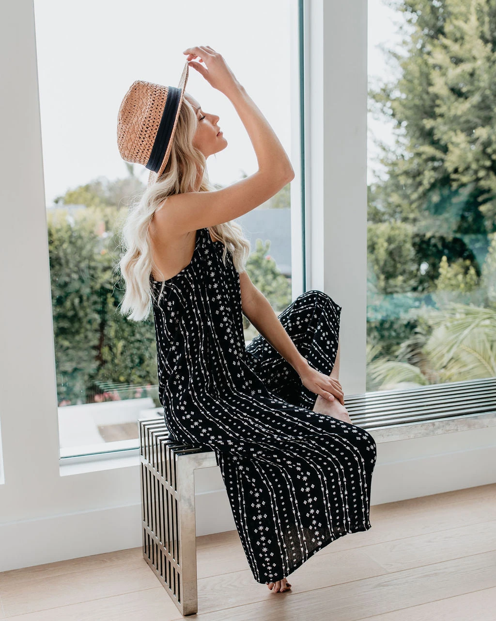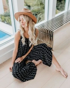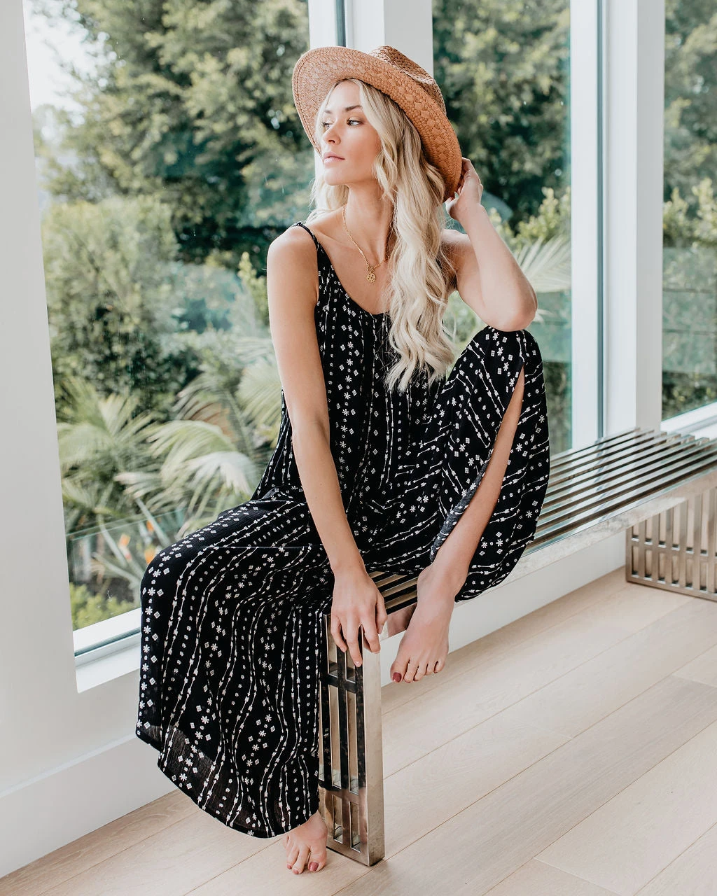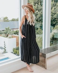 // Best Selling Silhouette // One of our most coveted silhouettes ever now with a new print! Our Baja Pocketed Tribal Jumpsuit has one of our favorite silhouettes with a billowy fit, cropped length, scoop neckline, culotte-style pant legs, and pockets! The black and white tribal print is stunningly simple and easy to transition through seasons. Pair with layered gold necklaces and a heeled sandal for a weekend ready look! Styled with our Velasco Hat and All In Your Dreams Necklace.