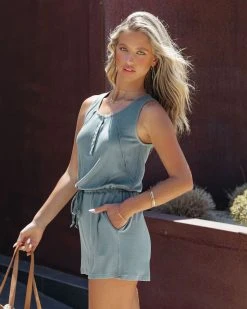 An everyday essential, the Grendel Pocketed Romper in seafoam features a scooped neckline and front button closures.