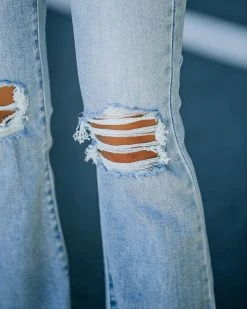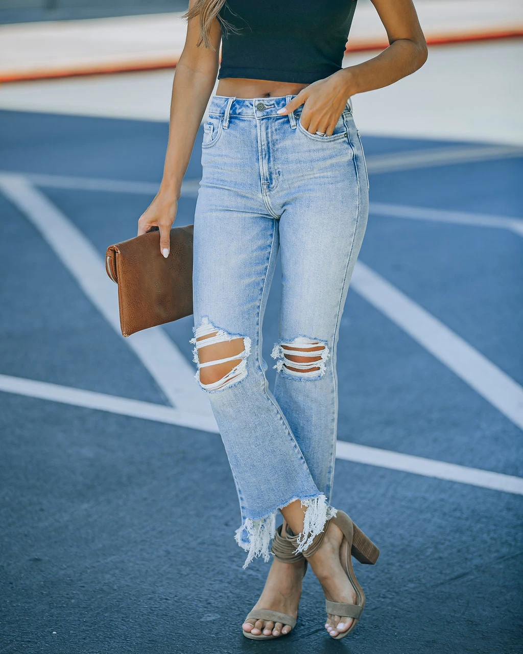 Perfect for everyday, the Neilson High Rise Distressed Straight Denim in medium blue wash that features distressing throughout.
