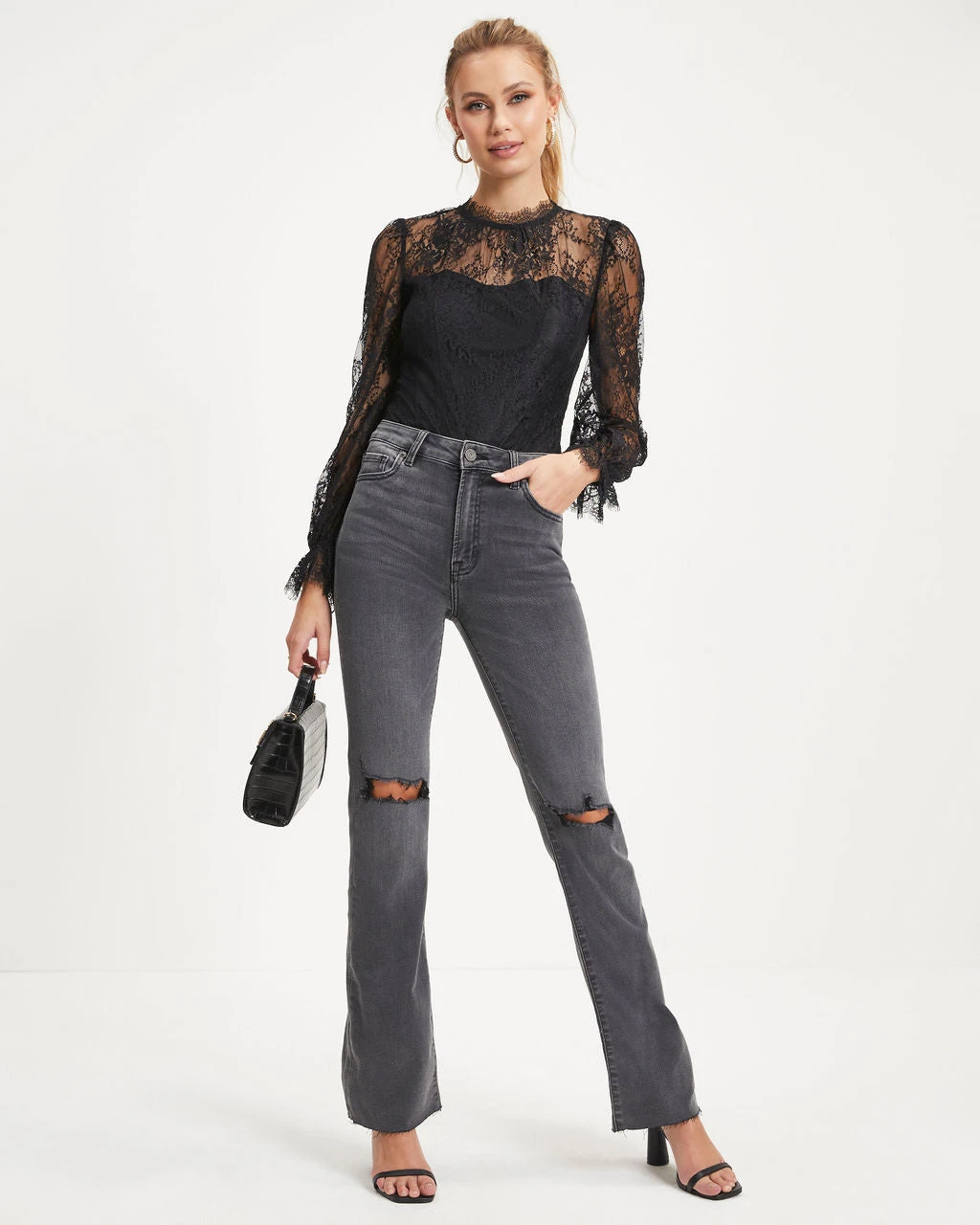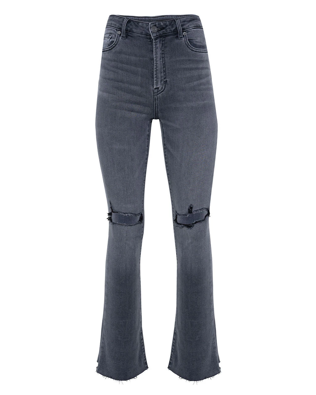 Cool girls will love the Harlow High Rise Stretch Distressed Wide Leg Jeans in charcoal that feature a straight leg.