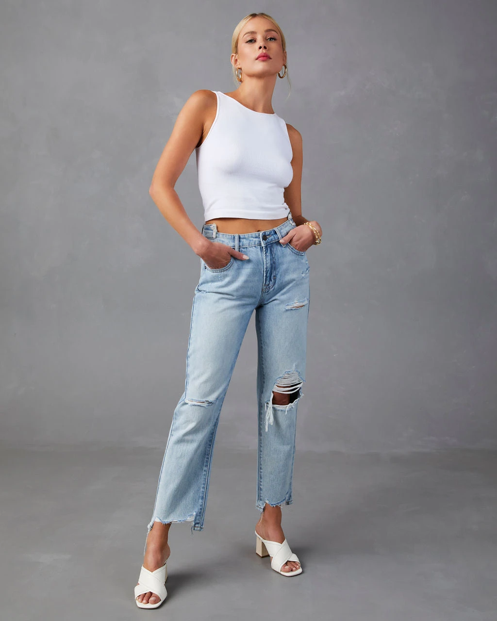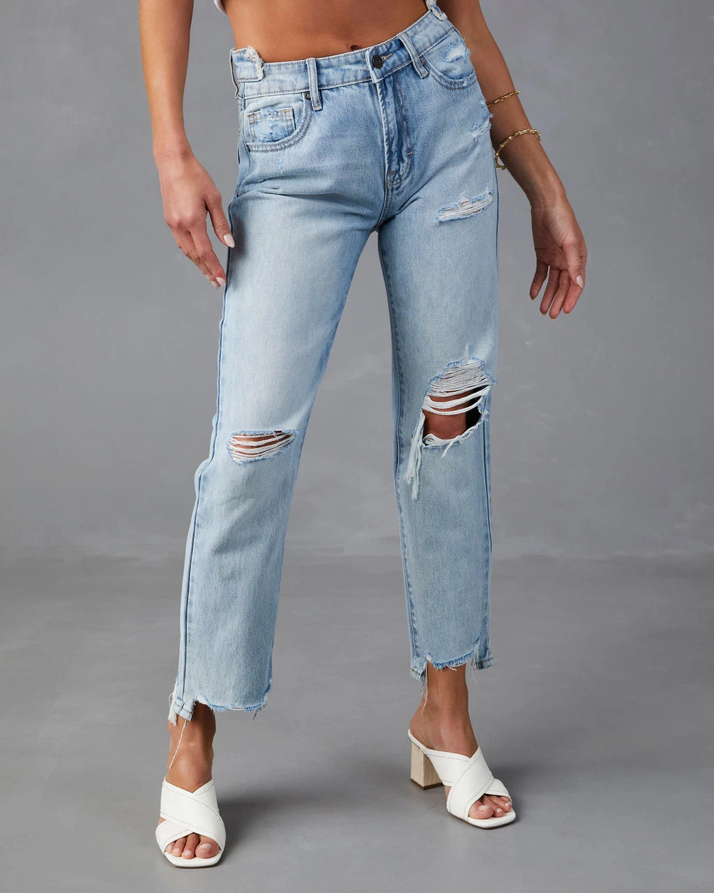 Model is Wearing a Size 25. Height is 5’7”, Bust is 33”, Waist 25.5”, and Hips 34”