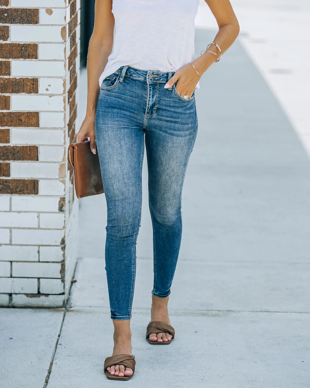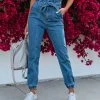 Look cool and trendy in the Shelly Distressed Flare Denim in medium wash that feature a high rise waist.