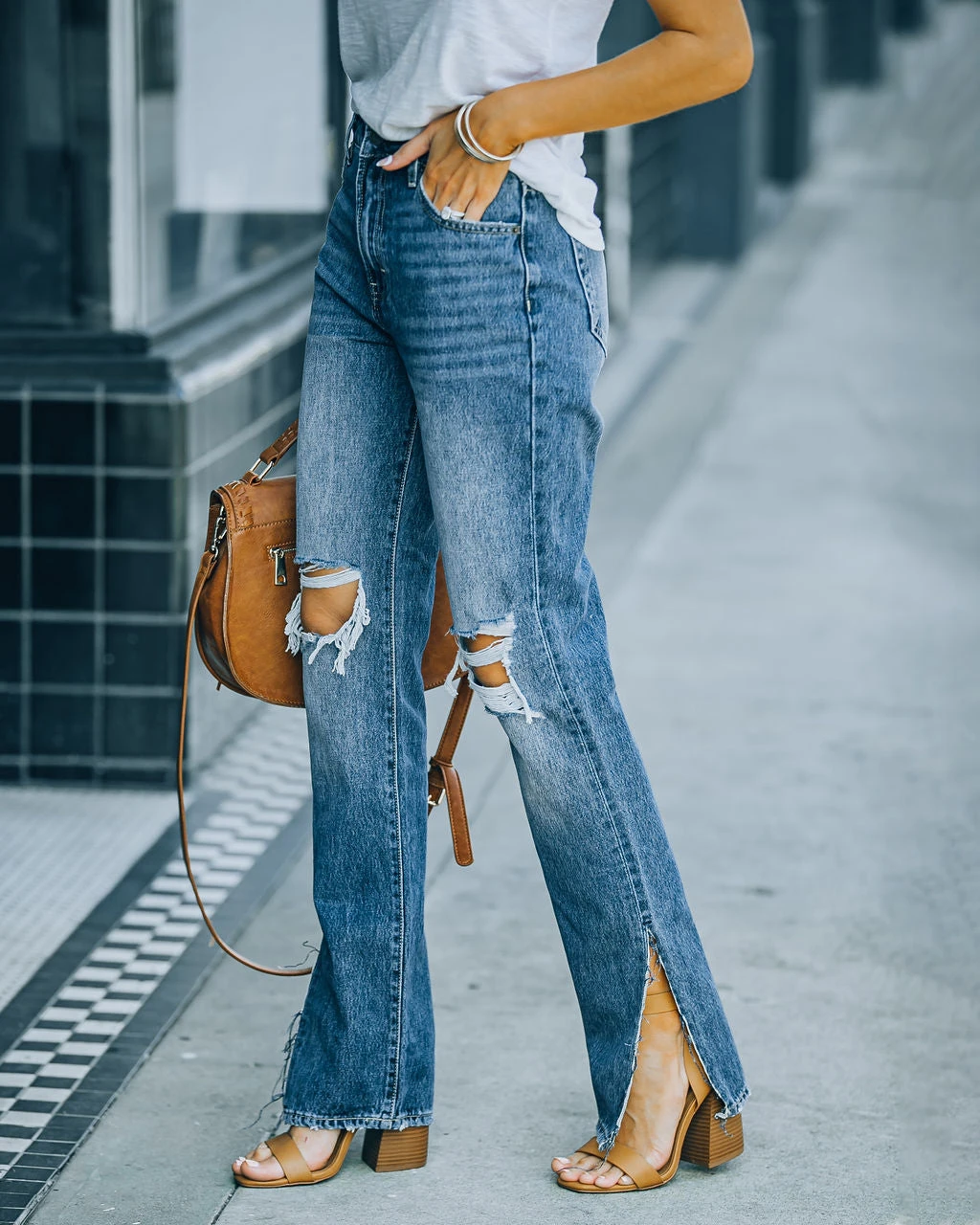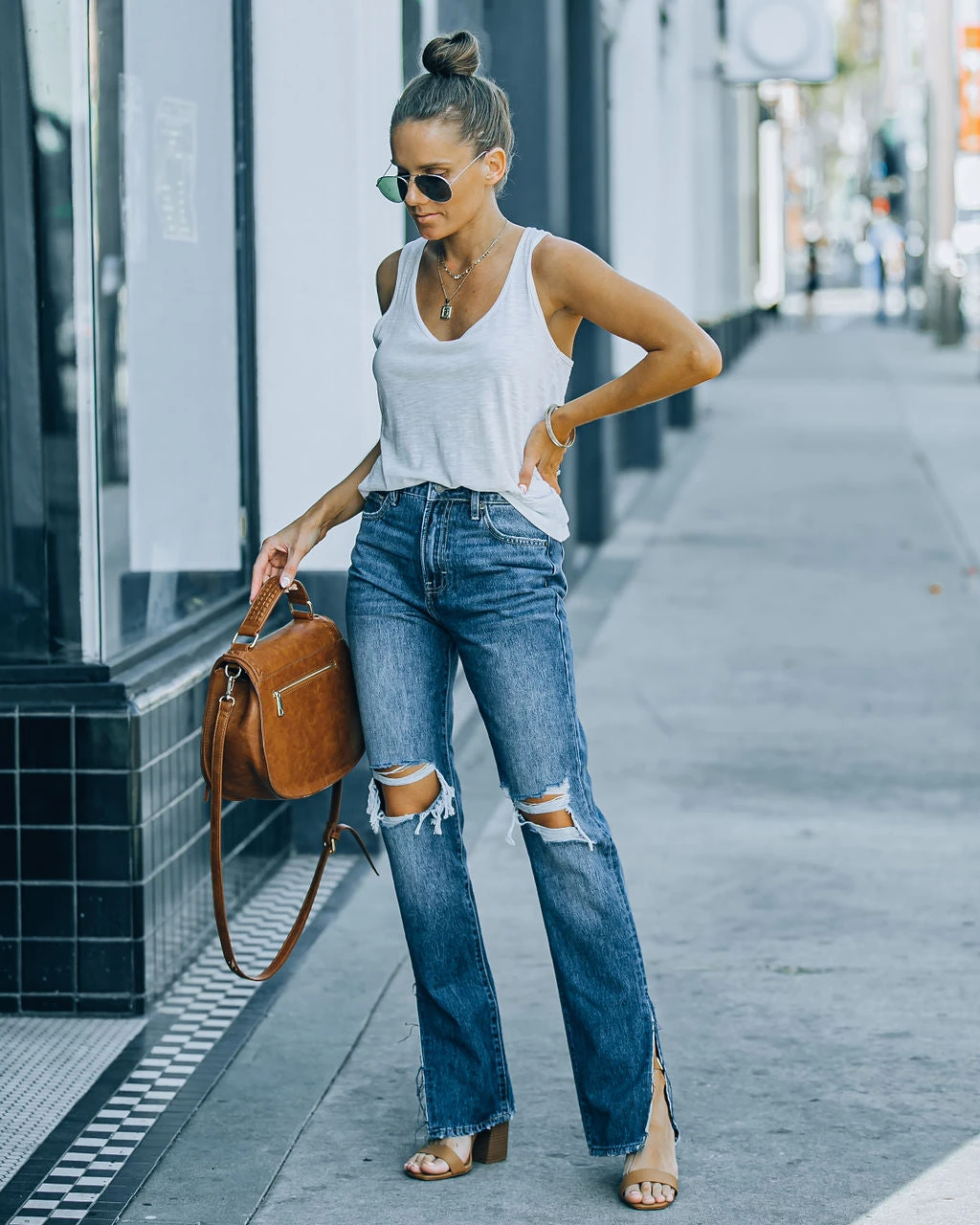 Styled with: Chloe Mini Necklace, Initial Card Necklace, Simple Bangle, Highland Bag, Physique Tank, and Chandler Sandal.