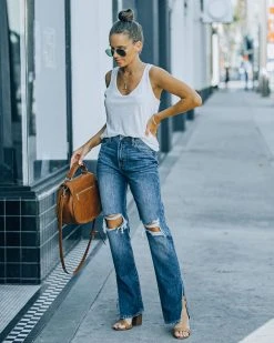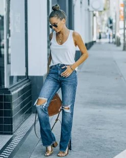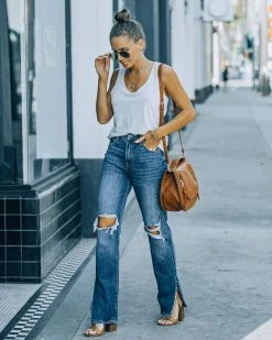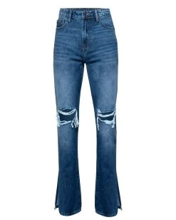 Cut from a dark wash non-stretch denim, the Tracey High Rise Distressed Split Ankle Denim is detailed with a split ankle and a flattering high rise.