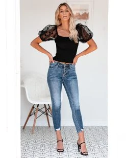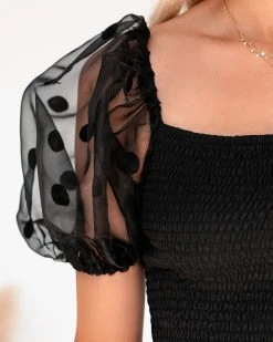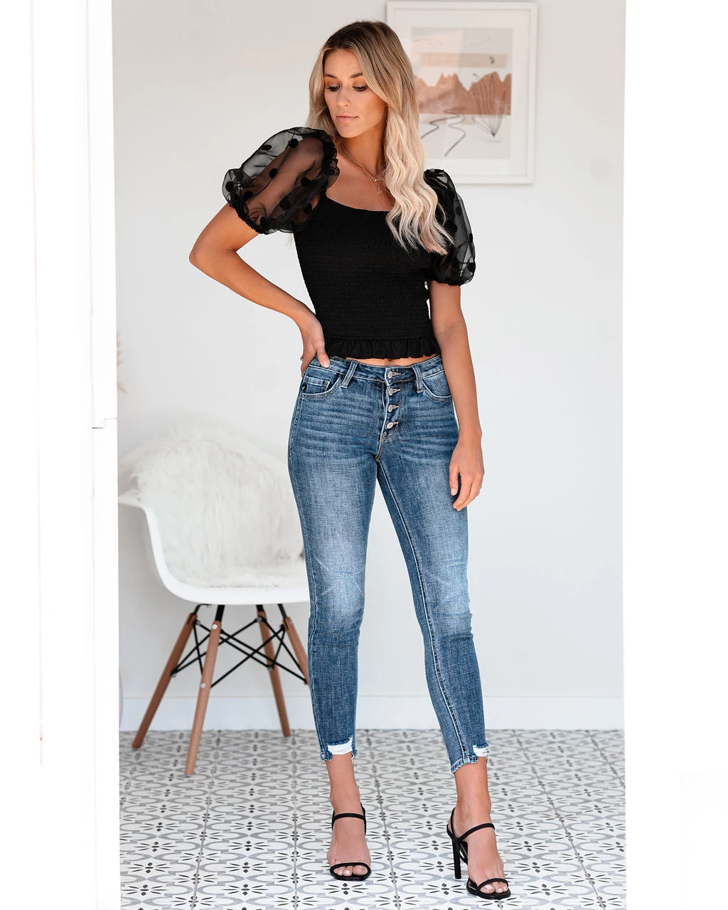 Our Kay Polka Dot Puff Sleeve Smocked Crop Top features a warm-weather femme vibe with over-the-top sleeves and a snug body! This black crop top is perfect to pair with high rise denim and heeled sandals for an effortlessly cute look! Finished with a ruffled hem. Styled with the Armadillo Hoops, Chloe Mini Necklace, French Mini Coin Necklace, Trending High Rise Button Front Skinny and the Clique Strappy Heeled Sandal.